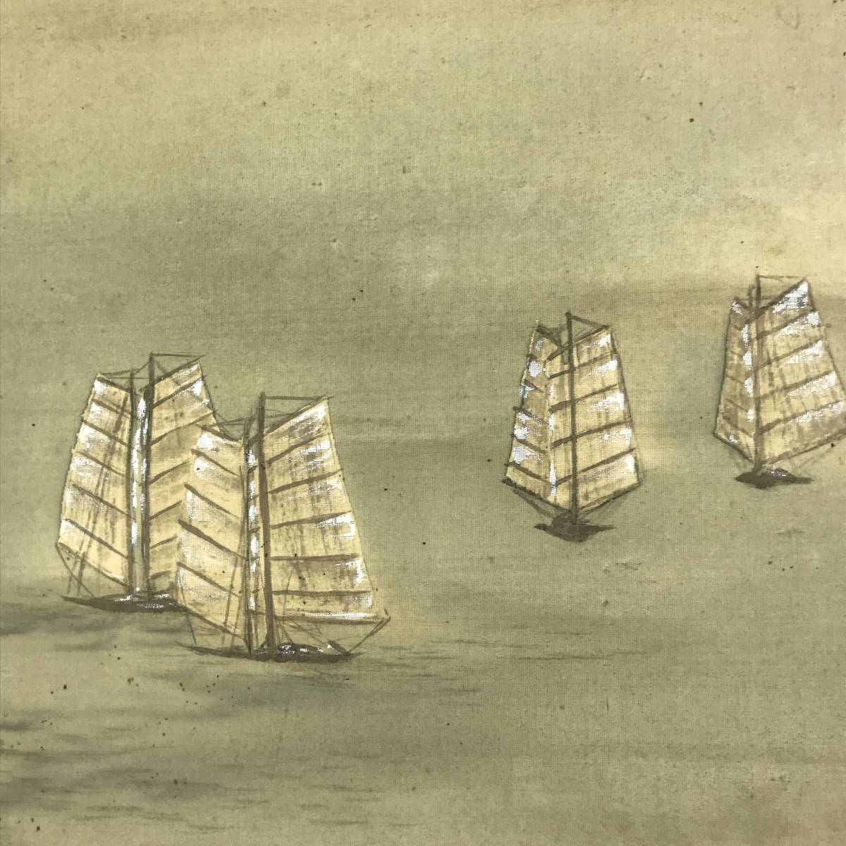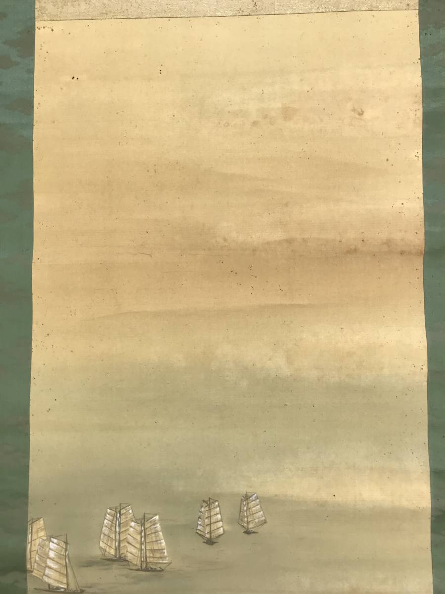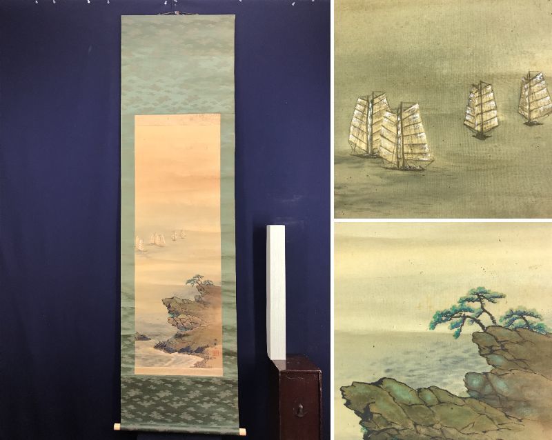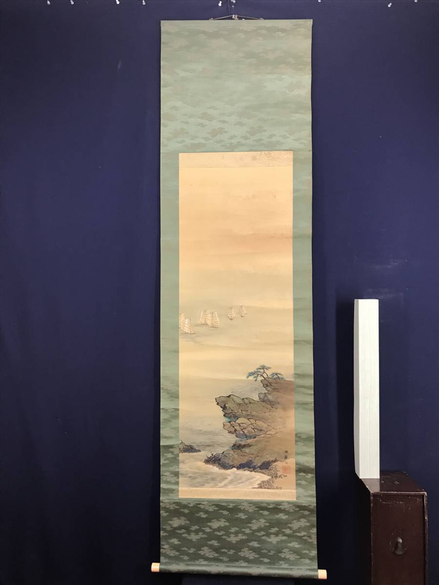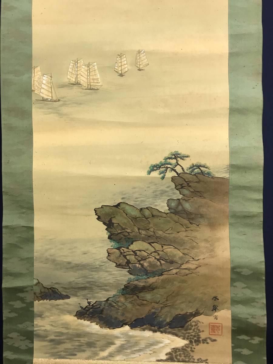 真作/春翠/海辺帆舟図/帆船図/山水図//掛軸☆宝船☆AD-680