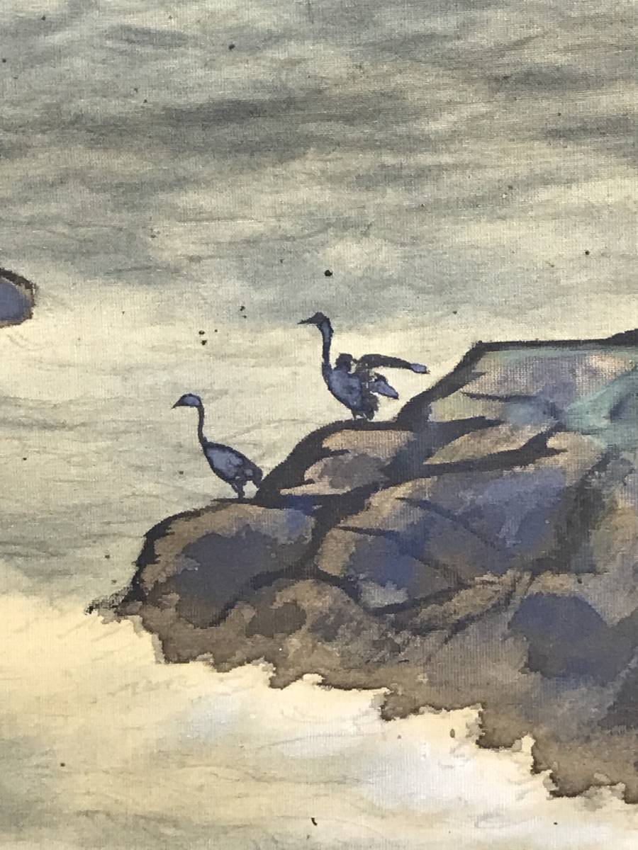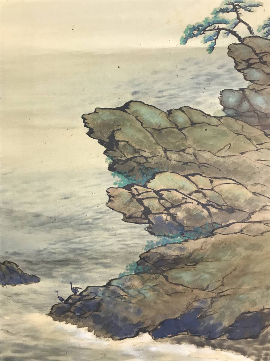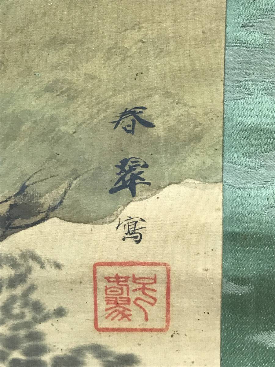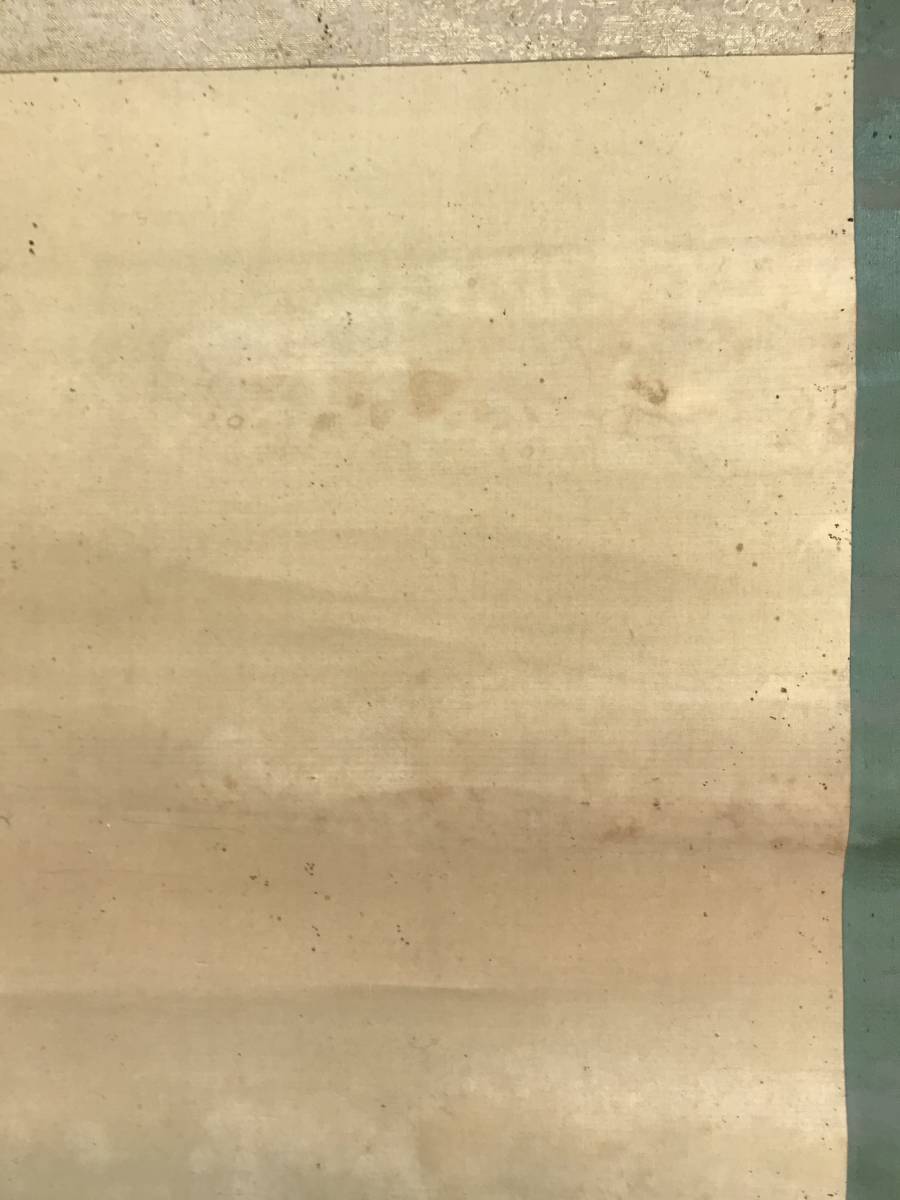 【作品状態】 本紙は絹本肉筆です。本紙は薄汚れ、全体によく目立つ多数の汚れシミ、糊シミ、巻シワなどあります。状態は悪いです。表装は薄汚れ、全体に汚れシミ、巻シワなどあります。