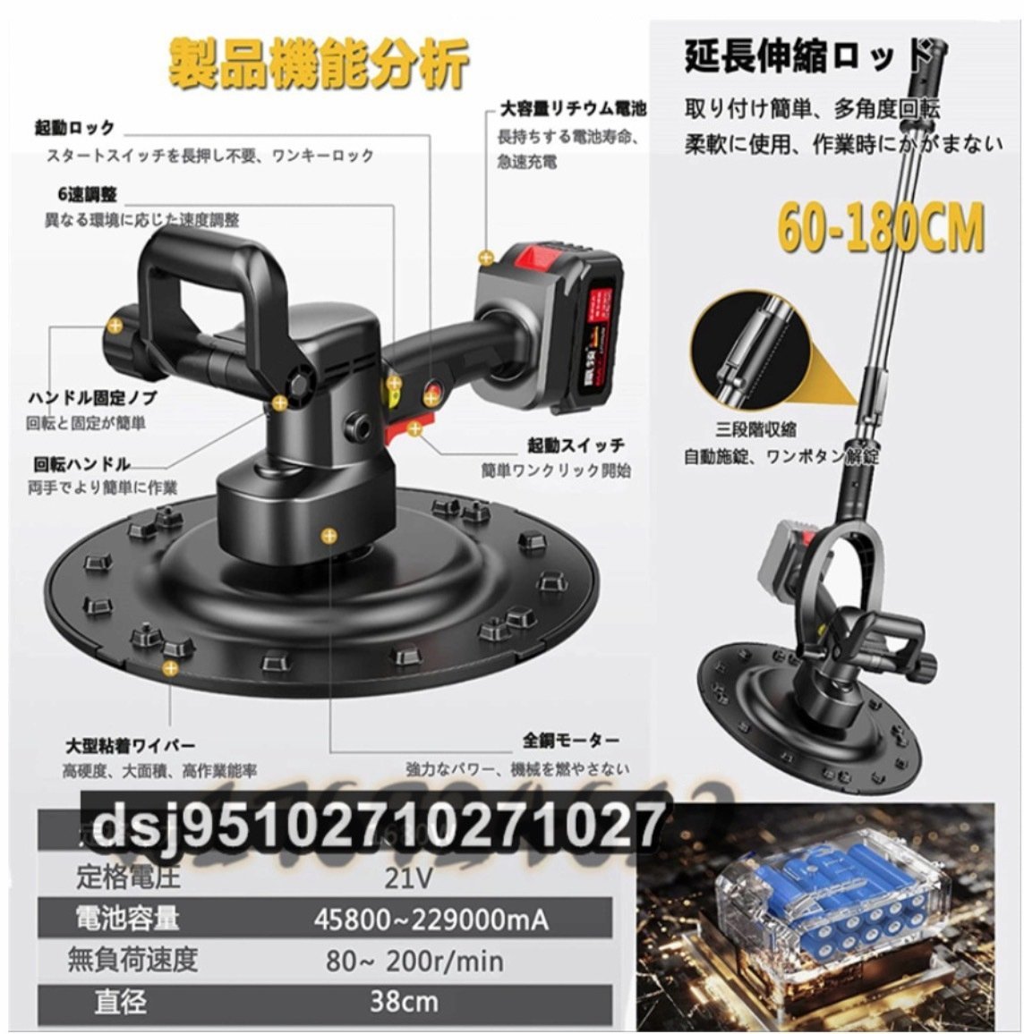電気サンダー セメント コードレス 65800mAh 延長ロッド伸縮可能 ポリッシャー コンクリート均し 壁面平滑化研磨機 6速調整