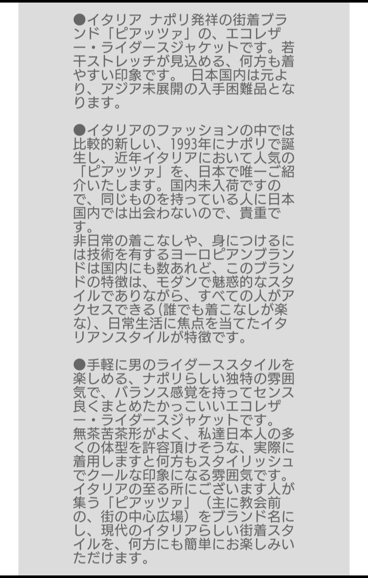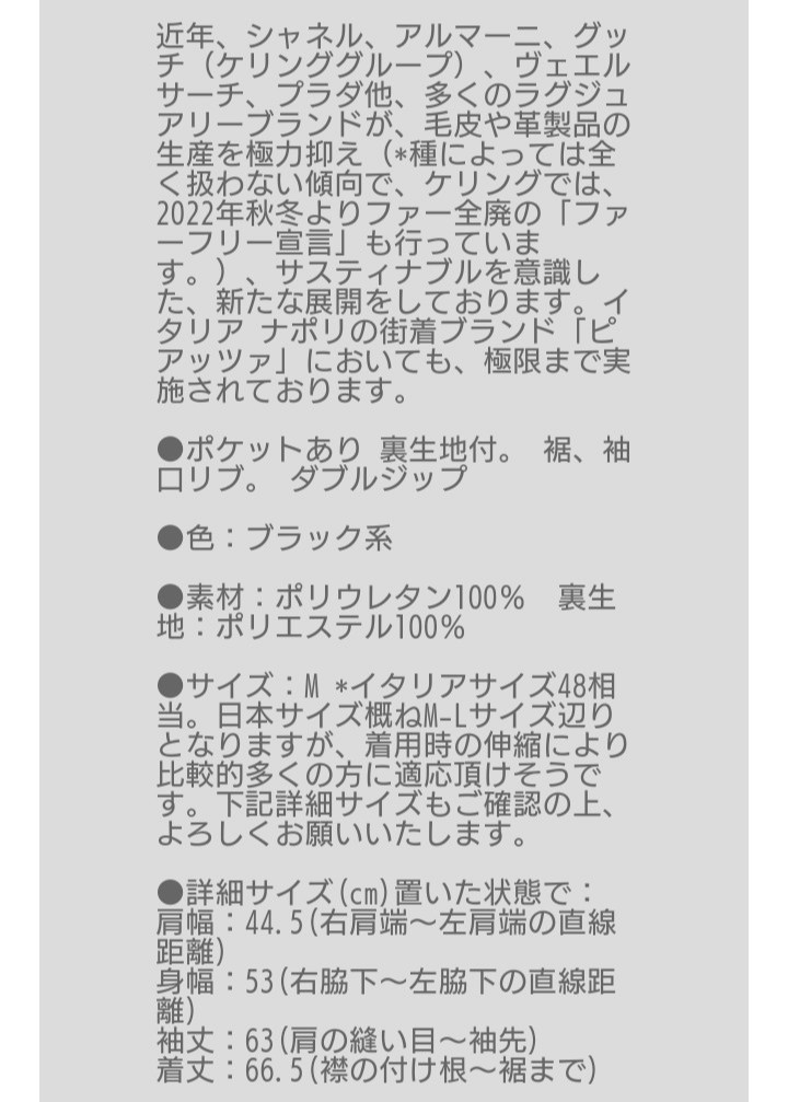 イタリア発のブランド【ピアッツァ】の、エコレザーライダースジャケットになります。