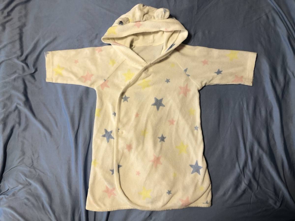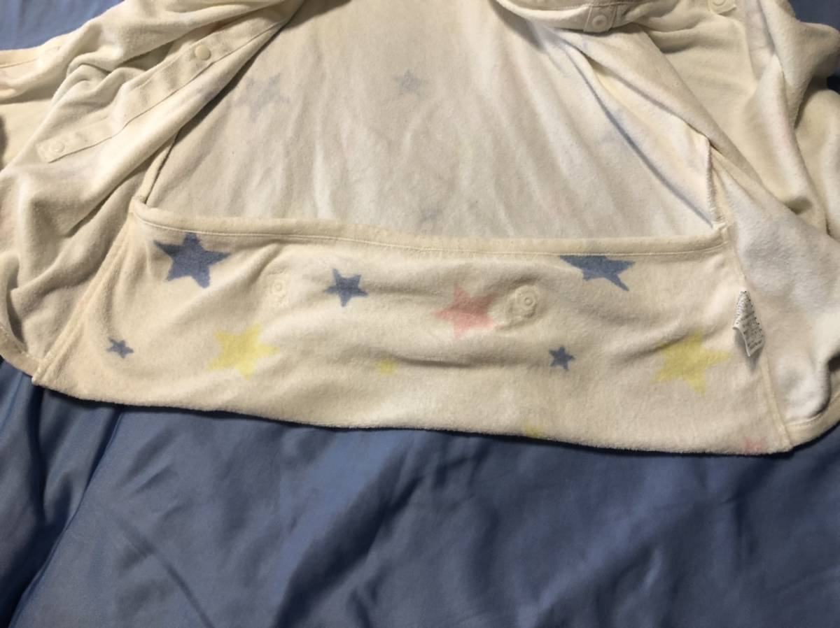 画像の通り、そのまま羽織ったり足の部分を留めたり、おくるみのようにしたりして使えます。