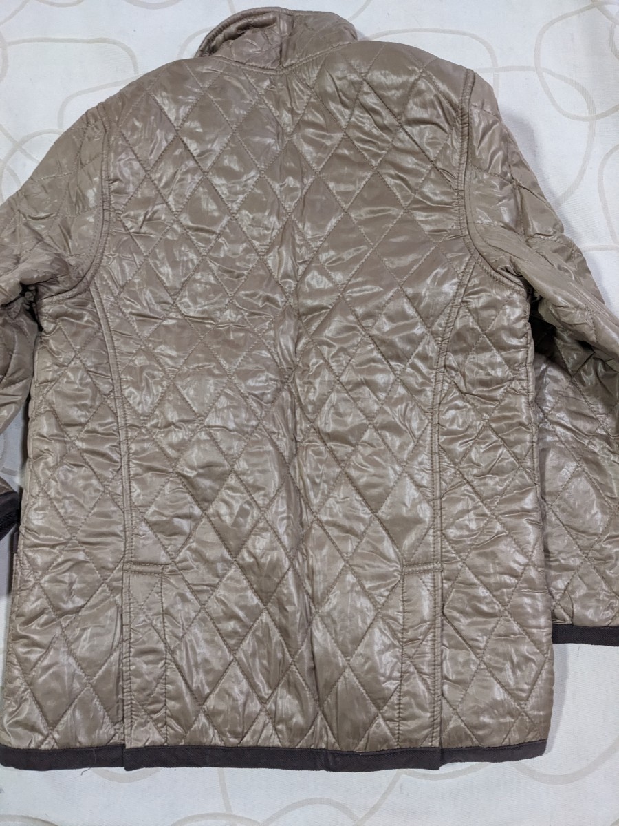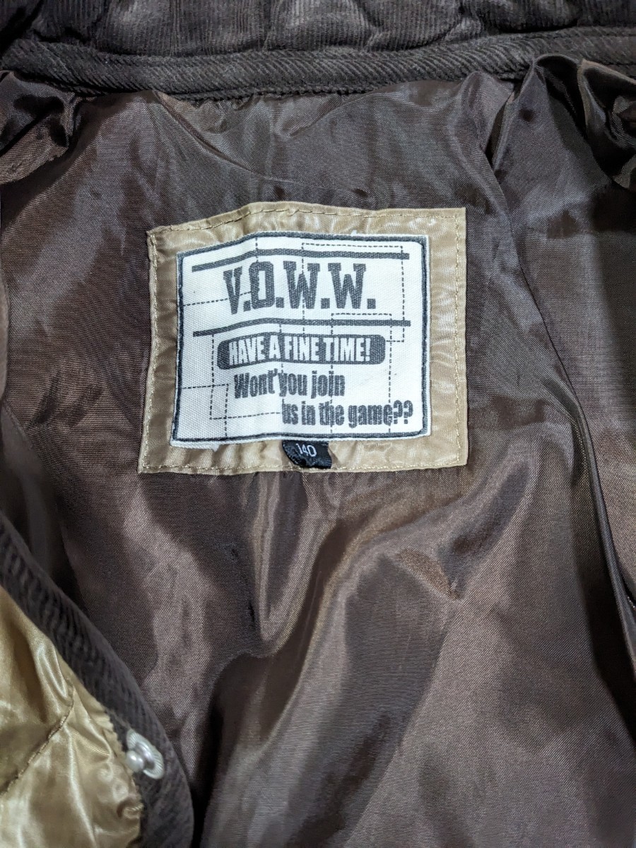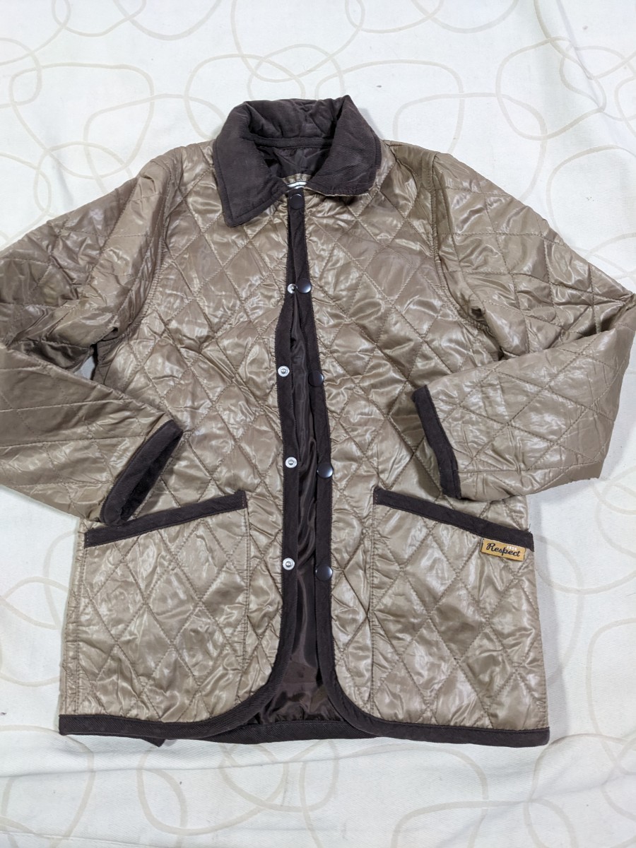 色味は表は落ち着いた色のカーキ色ですが 裏は茶色の裏地で襟元は コーデュロイです。
