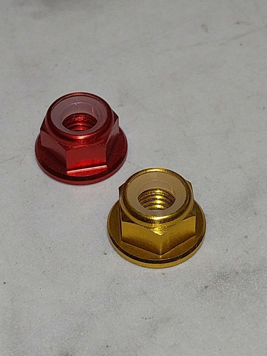 先に出品しているビスはピンク寄りのレッド(明るめ)です。こちらのフランジナイロンロックナットは濃い目のレッドです。ゴールドも同様です。