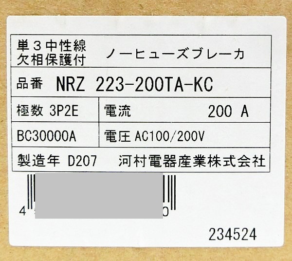 未使用品】 【激安処分】【送料無料】 河村電器 NRZ223-200TA-KC ノーヒューズブレーカ 漏電警報付 ■