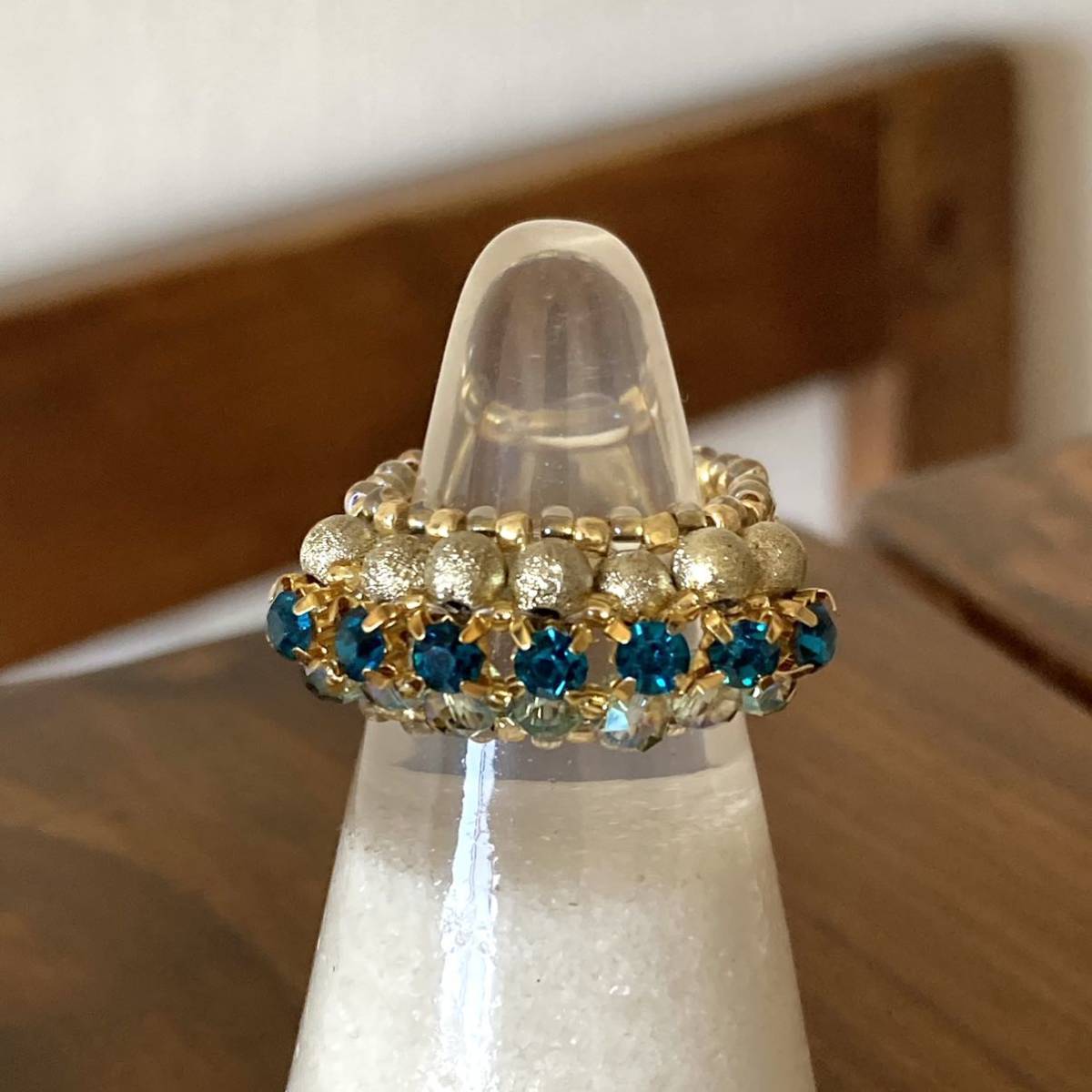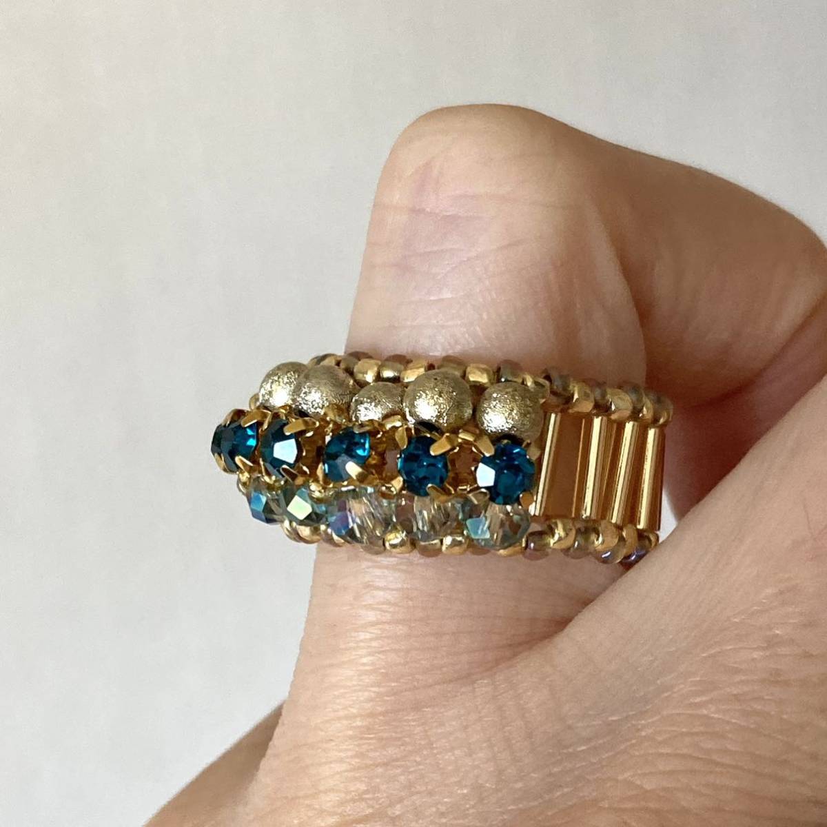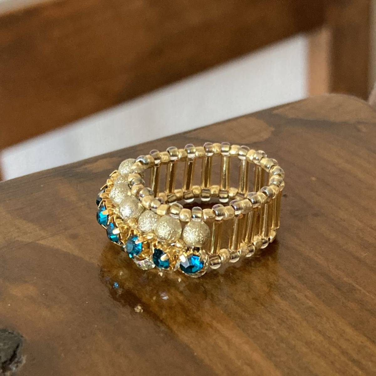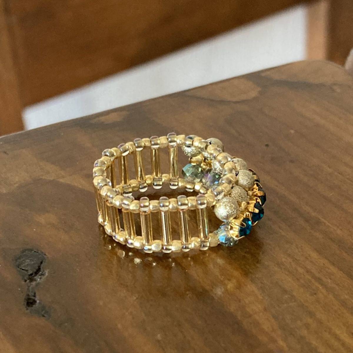 3mmのブルーグリーンのラインストーン、4mmのゴールドのラウンドビーズ、クリアグリーン系のボタンカットビーズ、竹ビーズ、ゴールドのスリーカットビーズ、丸小ビーズで作ったリングです。
