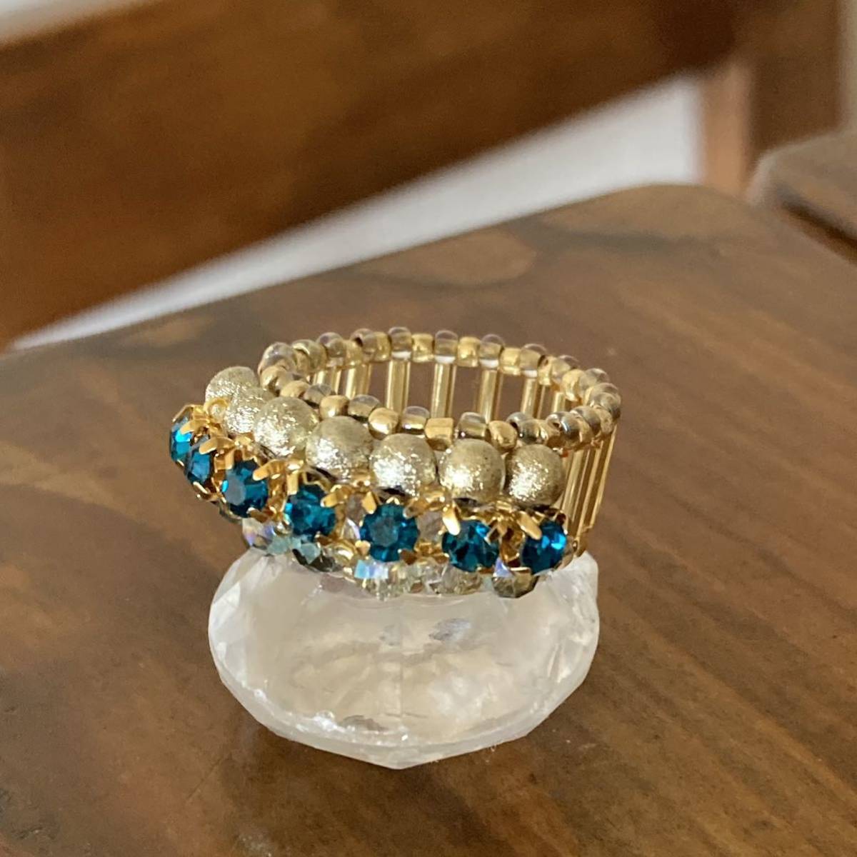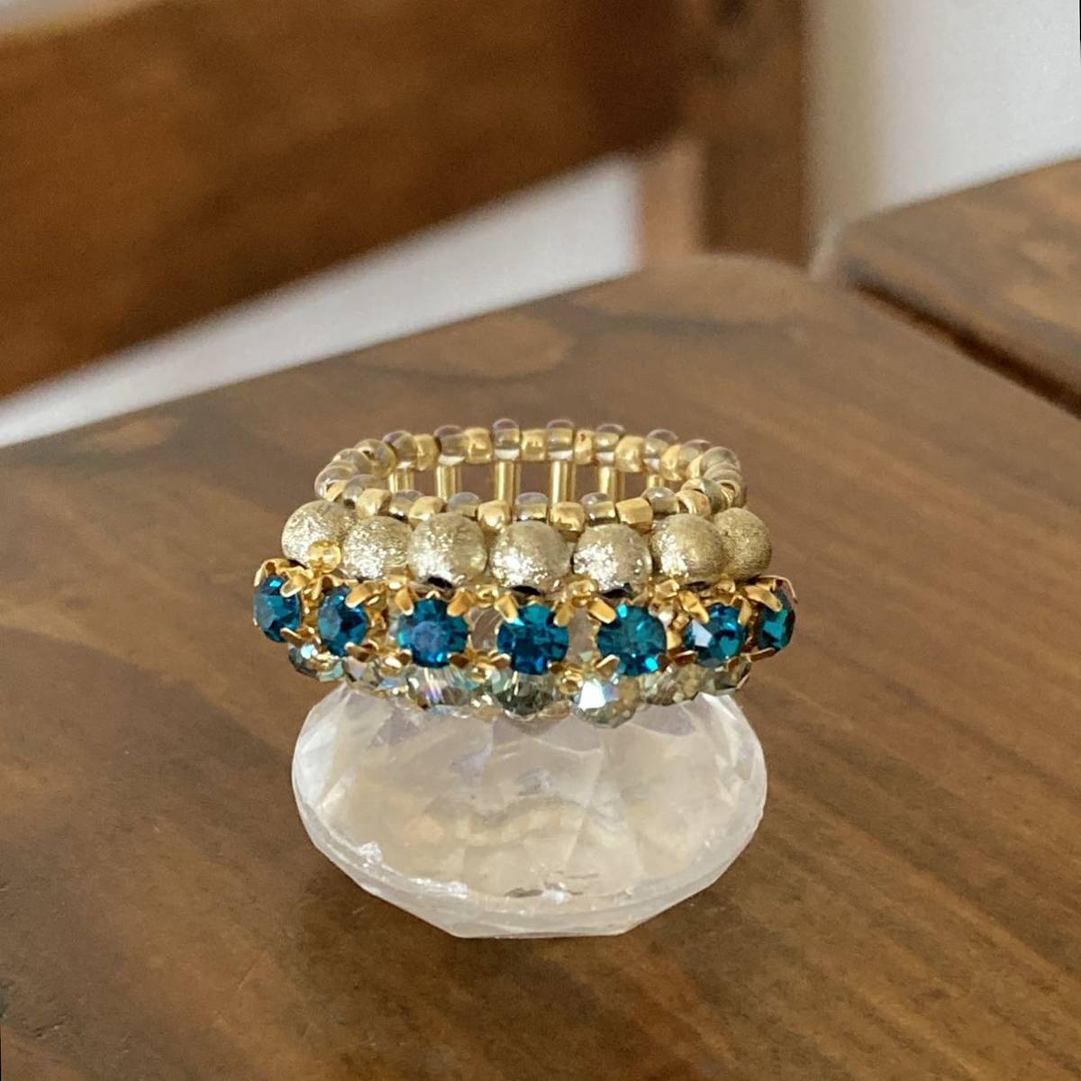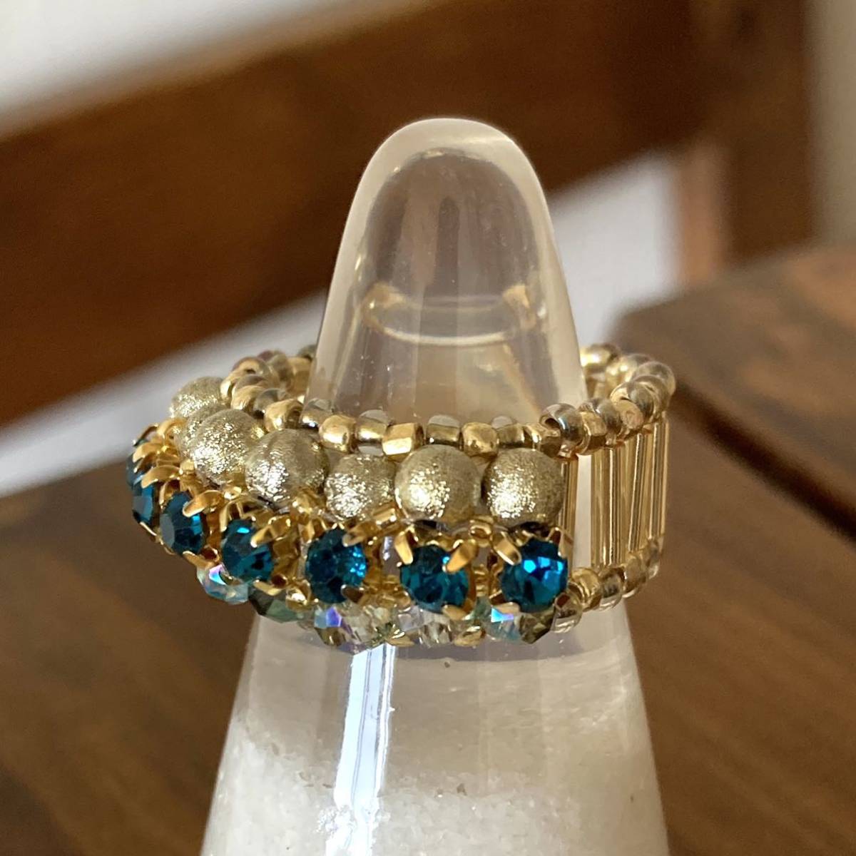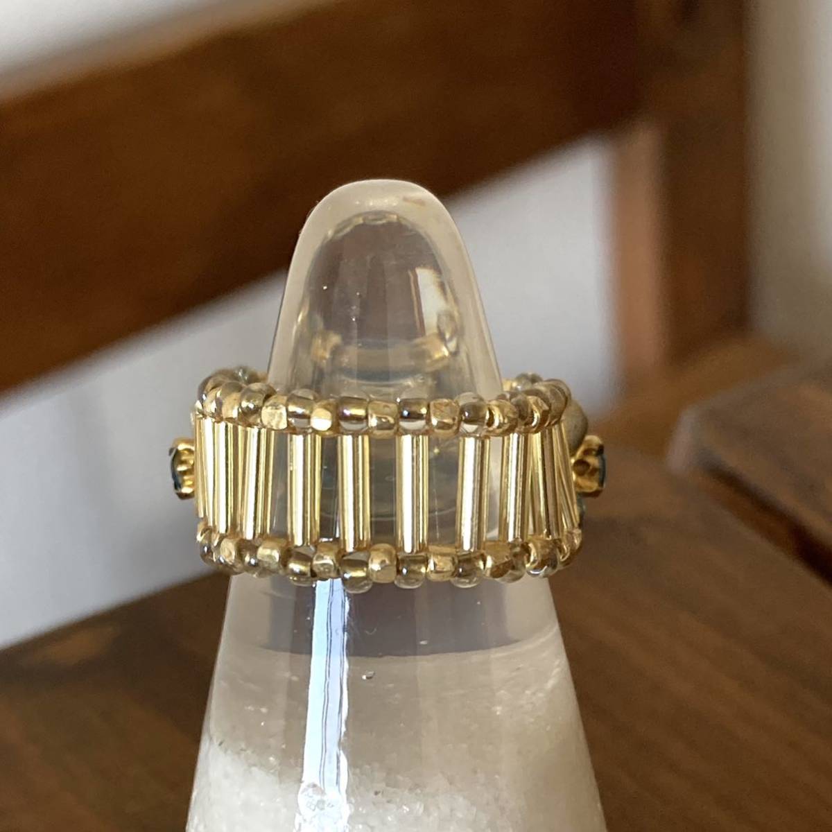 3mmのブルーグリーンのラインストーン、4mmのゴールドのラウンドビーズ、クリアグリーン系のボタンカットビーズ、竹ビーズ、ゴールドのスリーカットビーズ、丸小ビーズで作ったリングです。