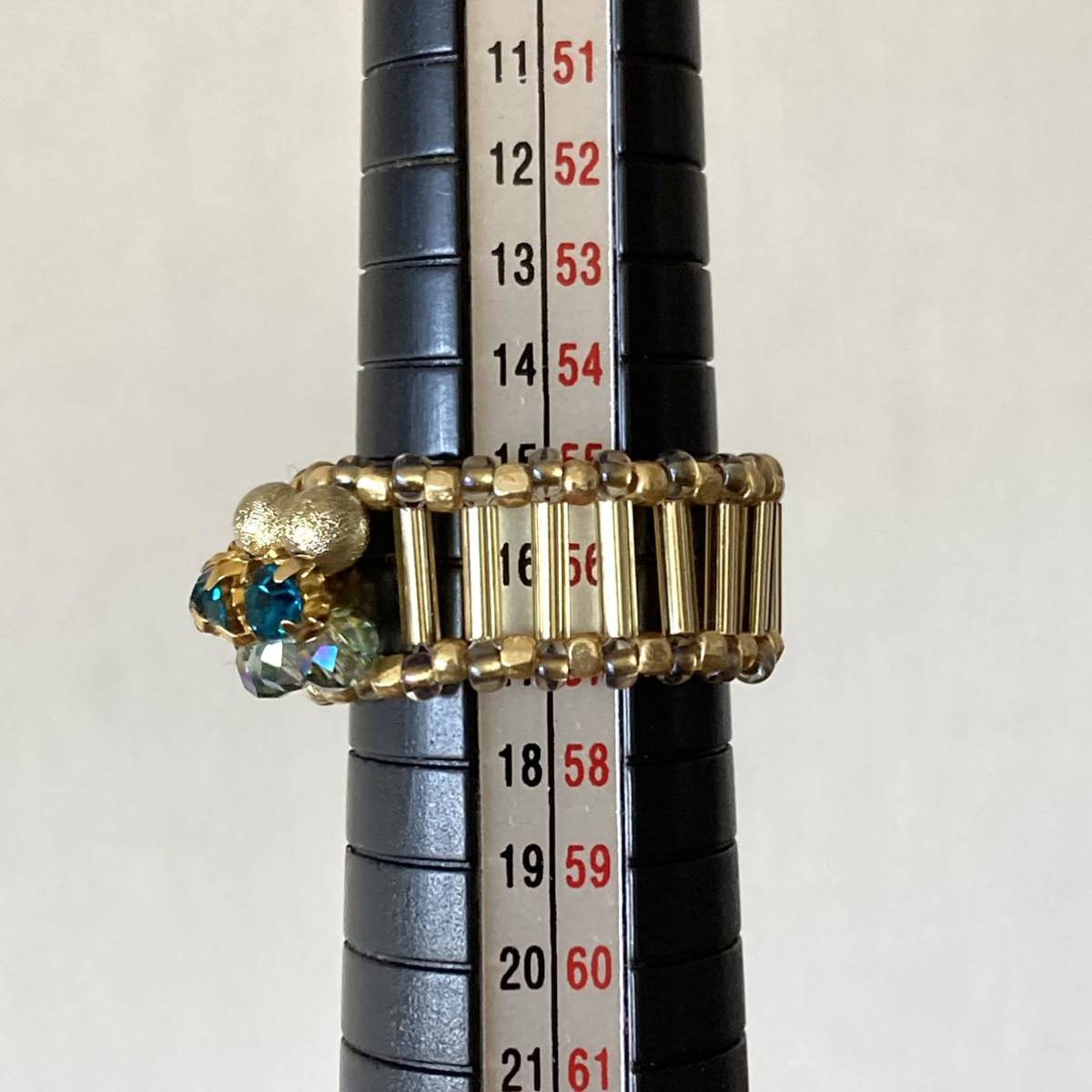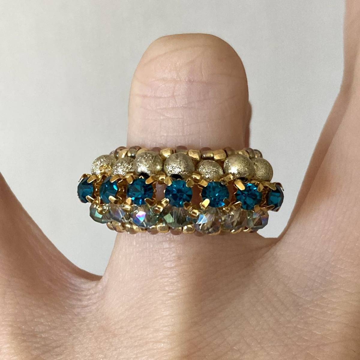ビーズ リング 指輪 ハンドメイド ラインストーンのパヴェ風リング ブルーグリーン×ゴールド 15-17号です。