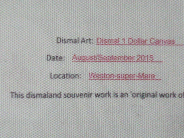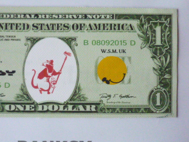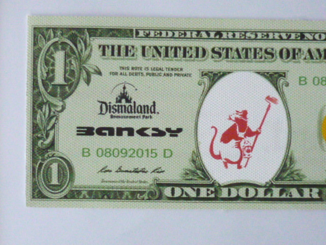 バンクシー Banksy (Banksy Dismaland ) 作品タイトル → ディズマル紙幣 1ドル 一枚の出品です。 ↓ ※ 1ドルのサイズ ↓約 約20.5 cm x 約9 cm 厚さ約 1mm ↓ ★出品の作品は、キャンバス生地です。 生地は柔らかい素材で掲載写真は丸まって見えたり、 曲がって見えますが額に入れますと綺麗になります。 ホテル内の倉庫を整理中に偶然見つけた ディズマル紙幣 です。(下記参照) BANKSYサイン入り ★未使用 ★本物保証