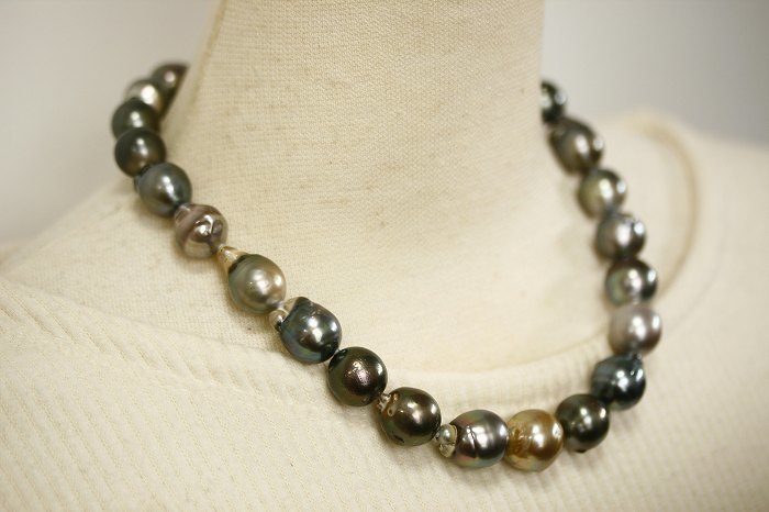 ハイボリュームのタヒチ黒蝶真珠ネックレスです。 15-12mmの特大サイズで組まれております。 落ち着きのあるマルチカラーの色合いに仕上がっています。 モノトーンのお洋服にもピッタリです。 キズは見られます。 欧米の女性にも愛される大珠ネックレスをぜひ一度お試し下さい。 | |