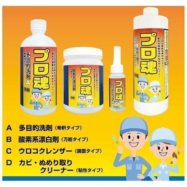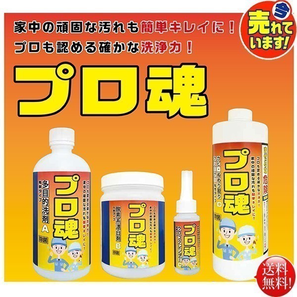 プロも認める本格派実力洗剤 家庭向け洗剤セット プロ魂 ![]() ・家中の頑固な汚れも簡単キレイに ・プロも認める確かな洗浄力 ・家中の掃除ができるお得な4本セット ![]() ![]() 【セット内容】 ●プロ魂 A:多目的洗剤(希釈タイプ)500ml● ・家中の気になる場所にスプレーするだけで、みるみるガンコな汚れを落とす多目的洗剤です ・さらに成分は自然のヤシや松・柑橘系の果物など植物由来成分を配合しているのでとっても安心です ●プロ魂 B:酸素系漂白剤(万能タイプ)500g● ・洗浄・漂白・除菌・・・3つの効果で一石三鳥 ・つけこんでおくだけで染み込んでしまった汚れを簡単に落とせる酸素系漂白剤です ・酸素と酵素のWパワーで洗浄・除菌・漂白が一気にできます ※全ての菌を除菌できる訳ではありません ●プロ魂 C:ウロコクレンザー(鏡面タイプ)80g● ・水周りにはコレ1本 ・水周りの厄介な汚れ・お風呂場の鏡のウロコ汚れ・頑固な水アカ・タイルの黒ずみ等を徹底的に除去 ・軽くこするだけで手軽に美しい輝きを取り戻せます ・しかも粒子が細かいから傷も付きにくい仕様です ●プロ魂 D:カビ・ぬめり取りクリーナー(粘性タイプ)1000ml● ・悪臭の原因、隠れた汚れを一網打尽!! ・水周りのしつこいカビや排水口のぬめりなど隠れた汚れを一網打尽にします ・排水口のつまりの原因の一つである髪の毛も分解する強力パワー ・とろみのある液体で悪臭の原因である排水管の中の汚れまでキレイにします ●付属品● ウエス・スプレーボトル・希釈ボトル・取扱説明書 【検索ワード】 洗浄魂 いい部屋ネット 大東建託 ショップジャパン |
