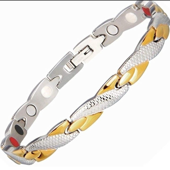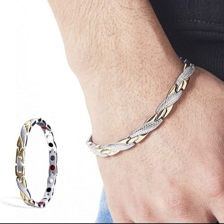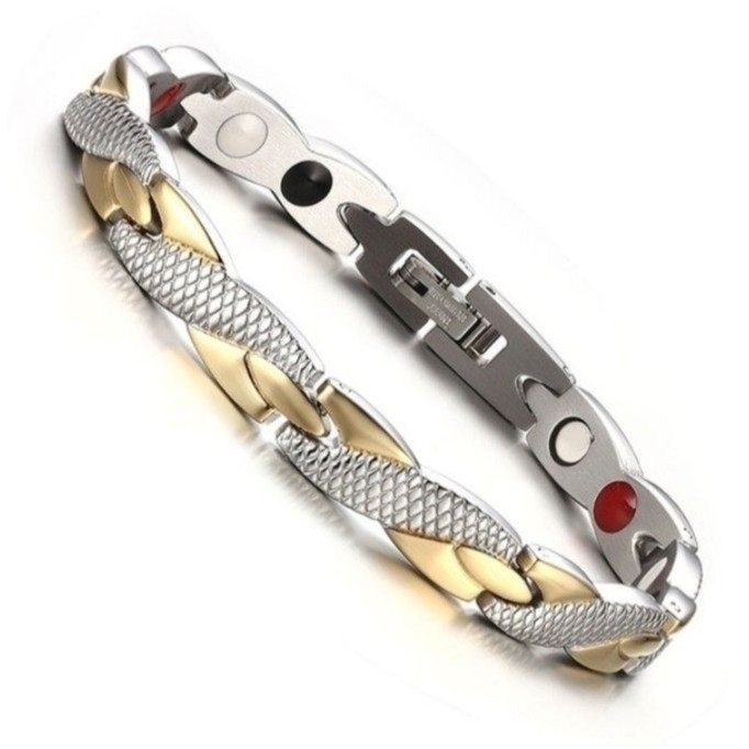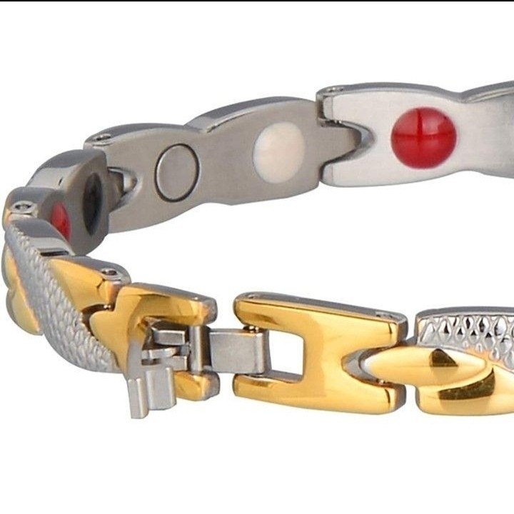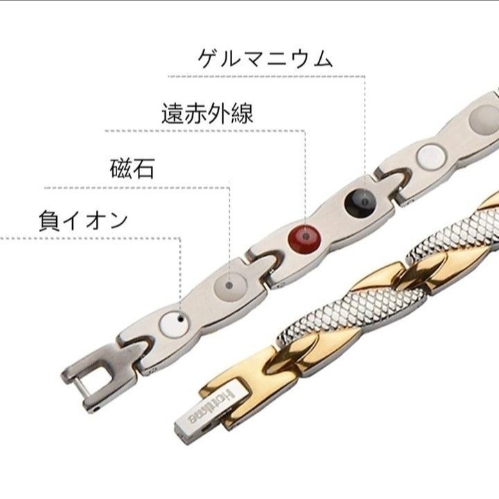 内側にはゲルマニウム、トルマリン、マイナスイオン、遠赤外線のストーン等が埋め込まれている磁気ブレスレットです。