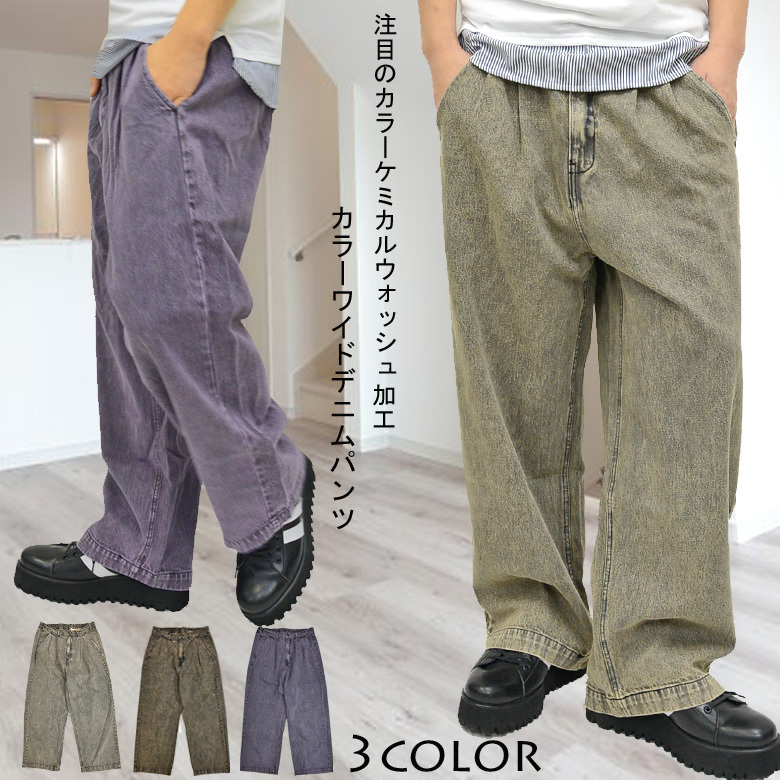 ワイドパンツ/デニムカラーパンツ/無地/ルーズパンツ/ジップフライ