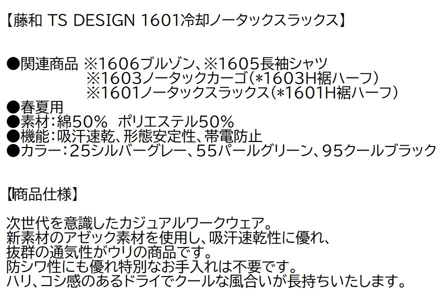 *同じシリーズ、春夏対応で ≪1606長袖ブルゾン、1605長袖シャツ、1601ノータックスラックス、1603ノータックカーゴパンツ、1601Hノータックスラックス裾ハーフ、1603Hノータックカーゴパンツ裾ハーフ≫ が、在庫ある分については出品されています