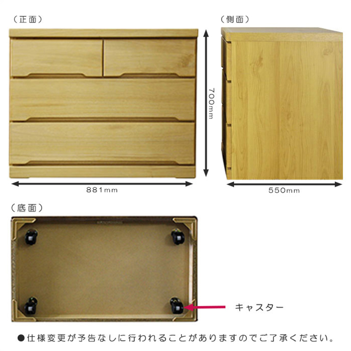 特  徴幅88cm桐材を使った、国産ローチェストです。引き出しは頑丈な箱組み。取り付け式の隠しキャスター付きです。