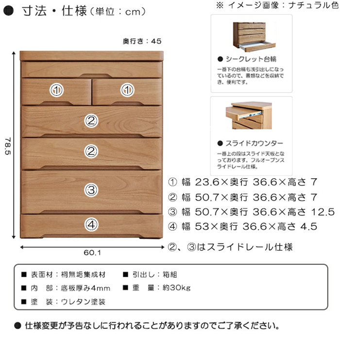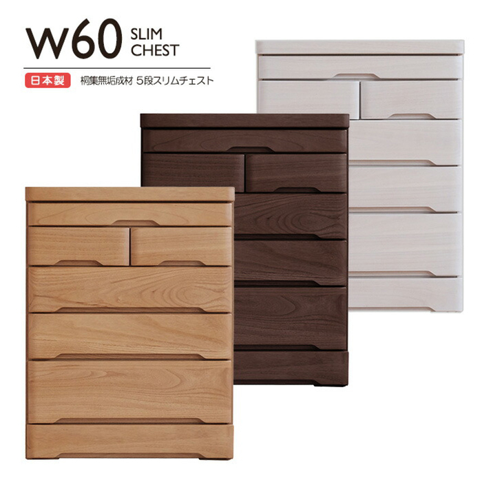 特  徴桐無垢集成材を使った、国産5段スリムチェスト。