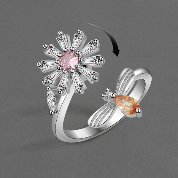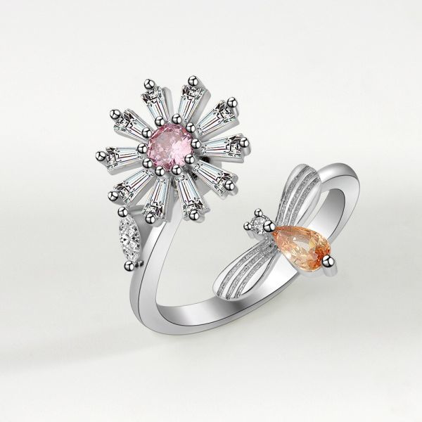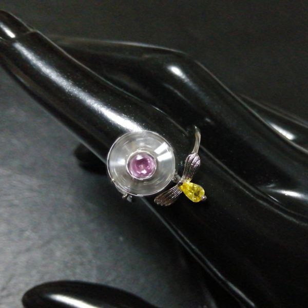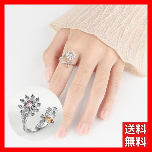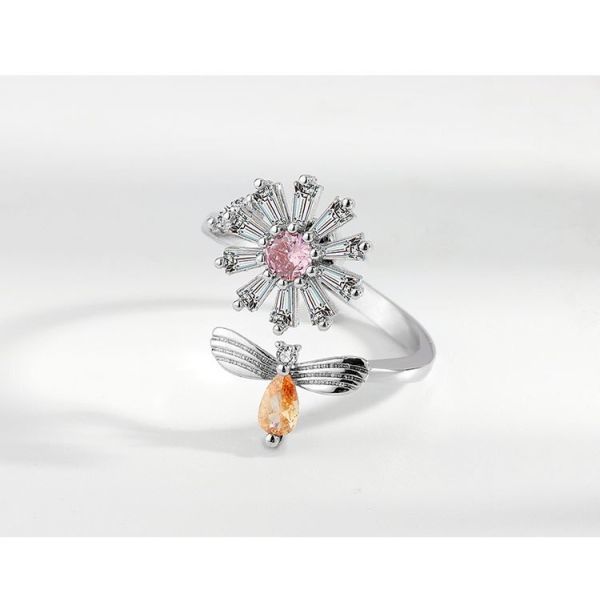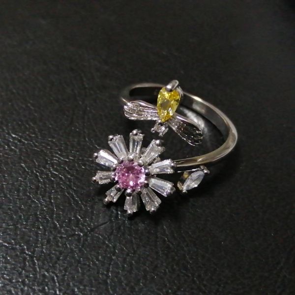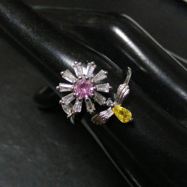 オープンリング 指輪 シルバー フラワー 花 蜂 cz ピンク オレンジ レディース 韓国 ビー ラインストーン #C1801-2