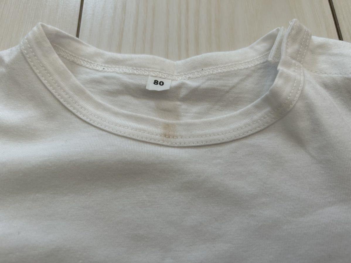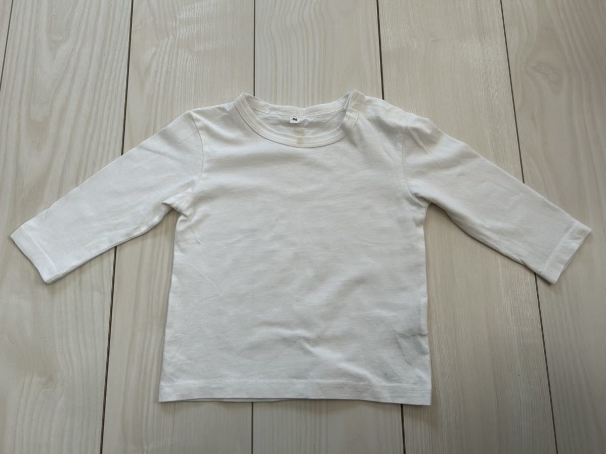 ☆ブランド・・・無印良品 ☆お色・・・白 ☆サイズ・・・80 平置きの状態で、身幅・・・27.5cm 着丈・・・31.5cm 袖丈・・・23.5cm 素人寸法ですので参考程度にお考え下さい。 ☆薄手の長袖Tシャツです。 着用回数は少ないですが、写真の通り首元にシミがあります。 ご理解の上ご入札下さい。 ☆細かいことをお気にされる方、神経質な方は入札をご遠慮下さい。 ☆自己紹介も必ずお読み下さい。