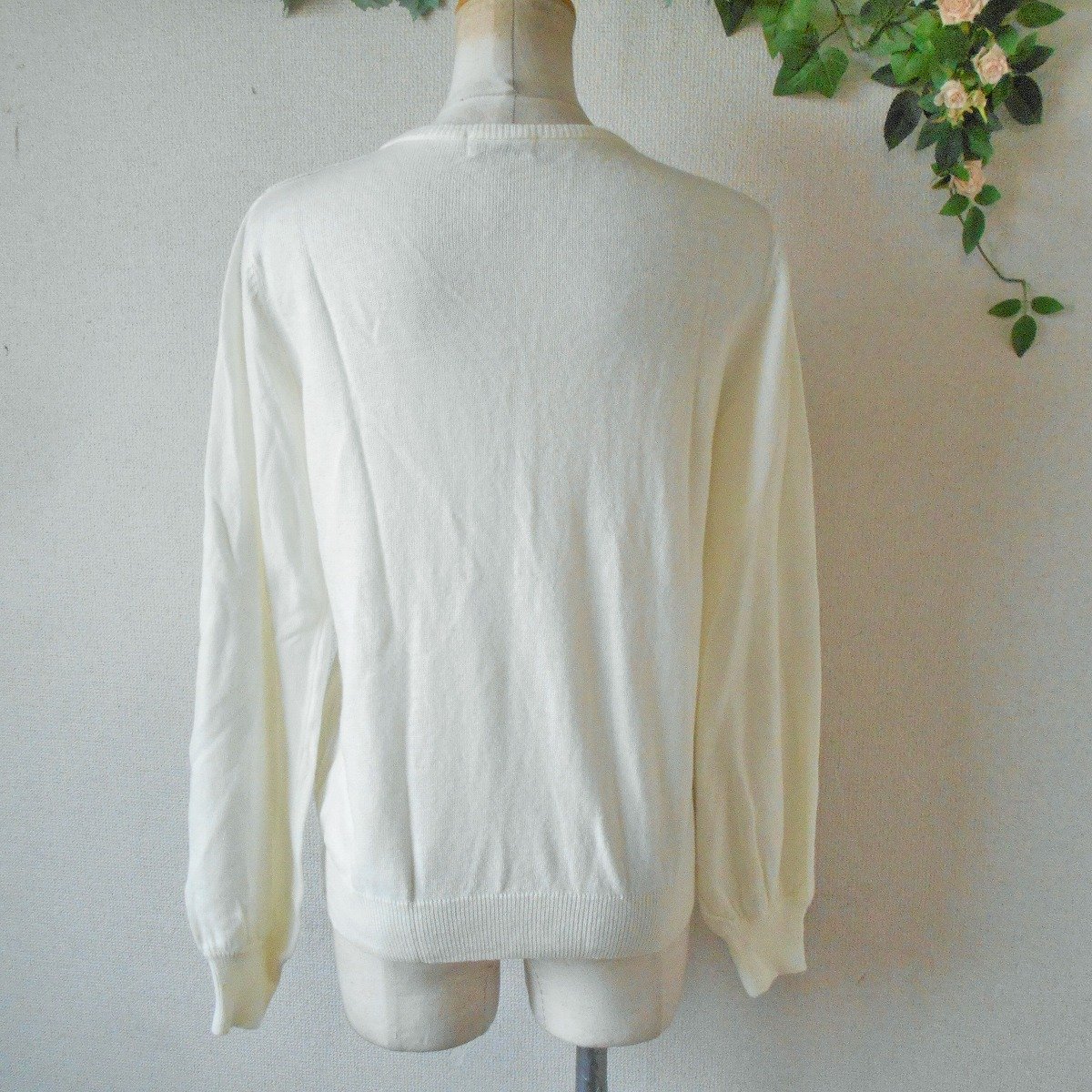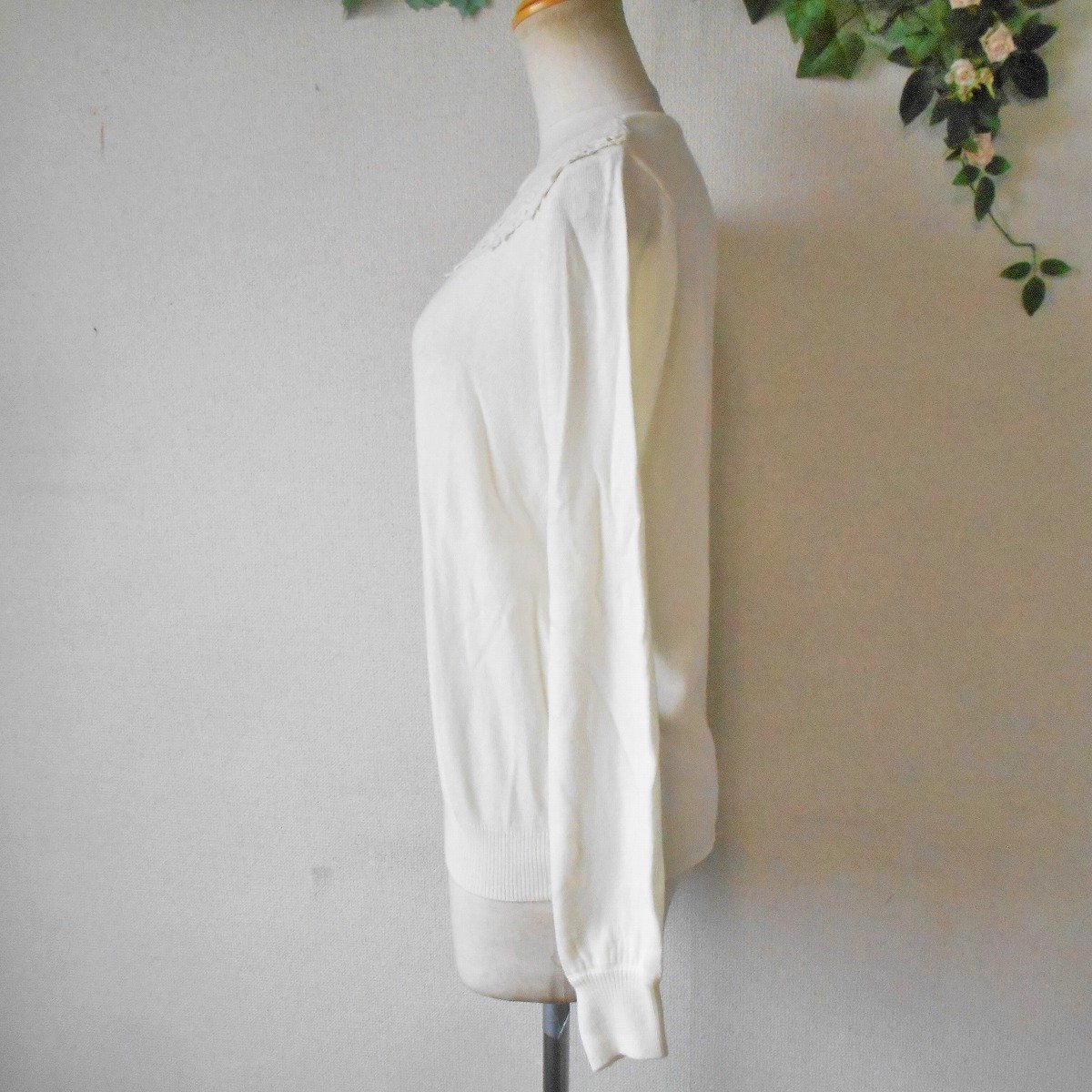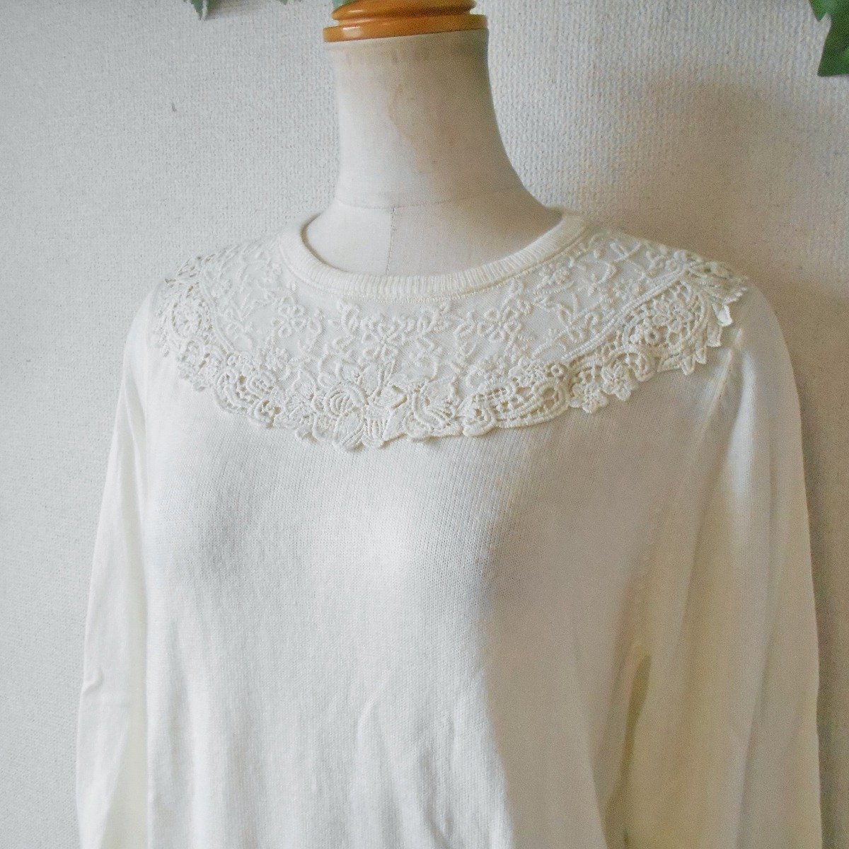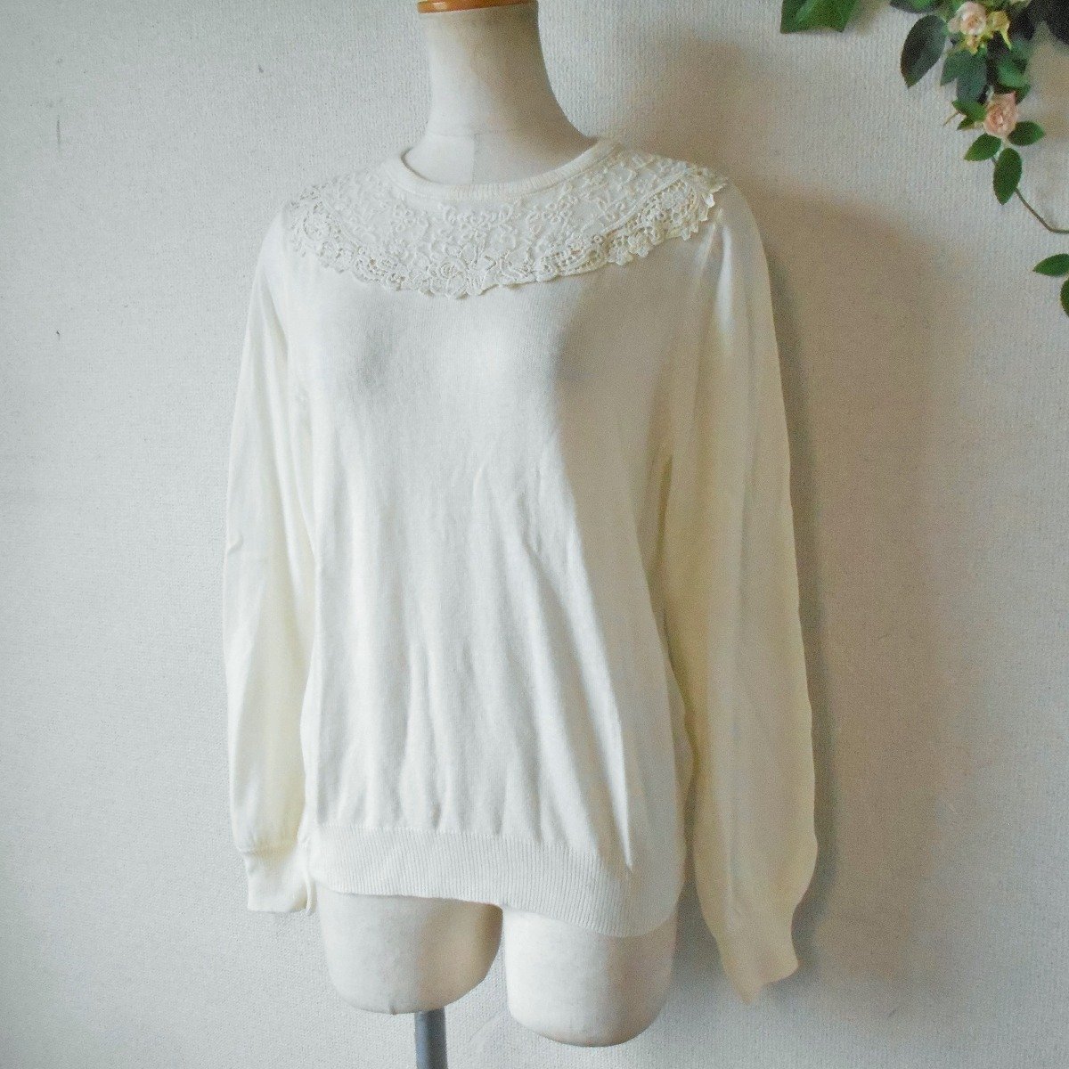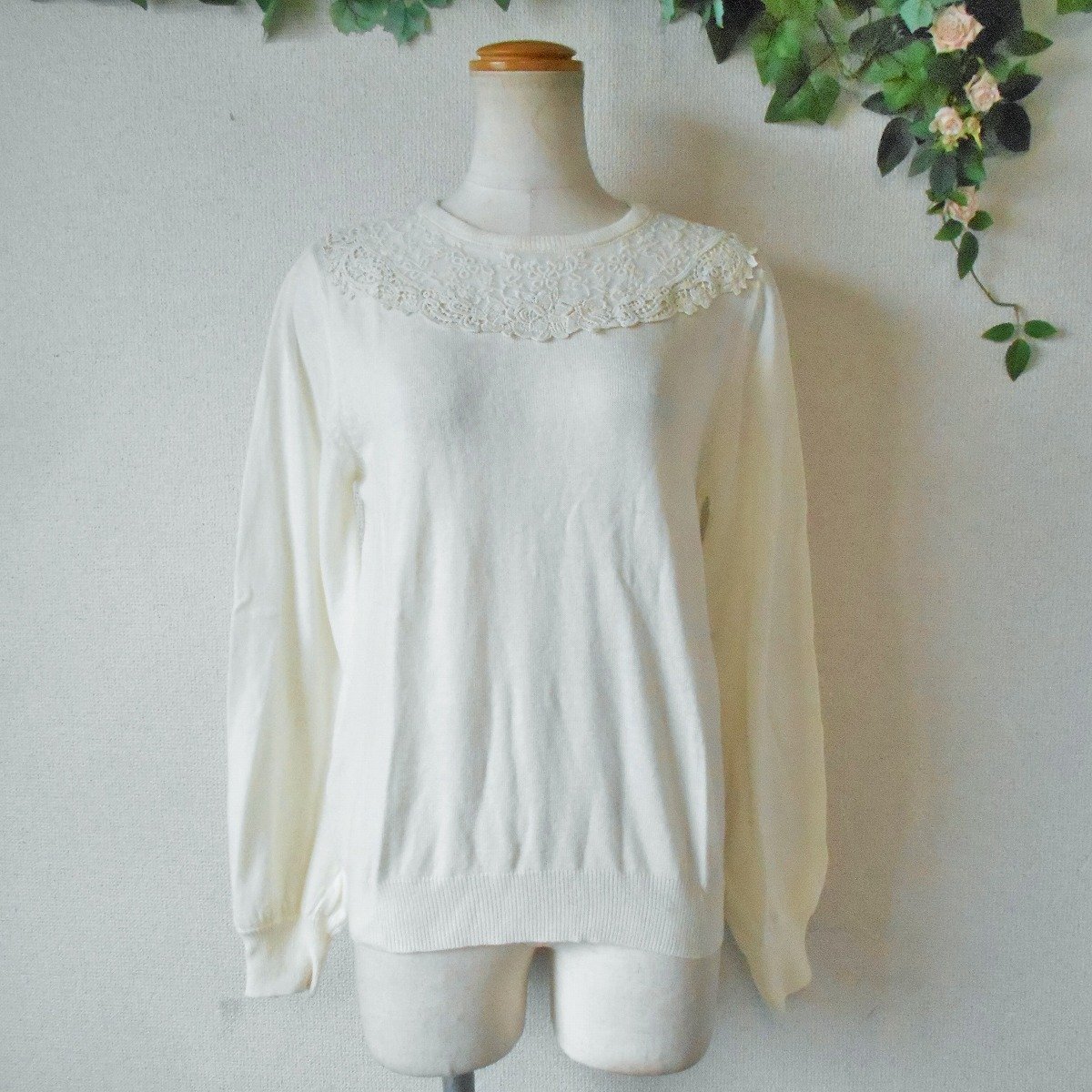 【ポイント】アースミュージック&エコロジーの薄手セーターになります。お色はオフホワイトで、秋冬春の3シーズン使えるお品です。首元にはレースが使用された、とってもかわいい一着です。