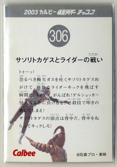 | ◆防水対策 厚紙補強 カルビー 仮面ライダーチップスカード(2003 復刻版) 306番 サソリトカゲスとライダーの戦い トレカ 即決 | |