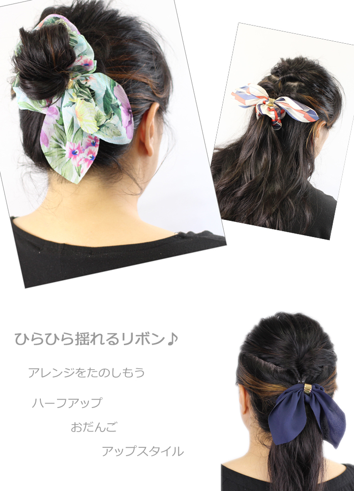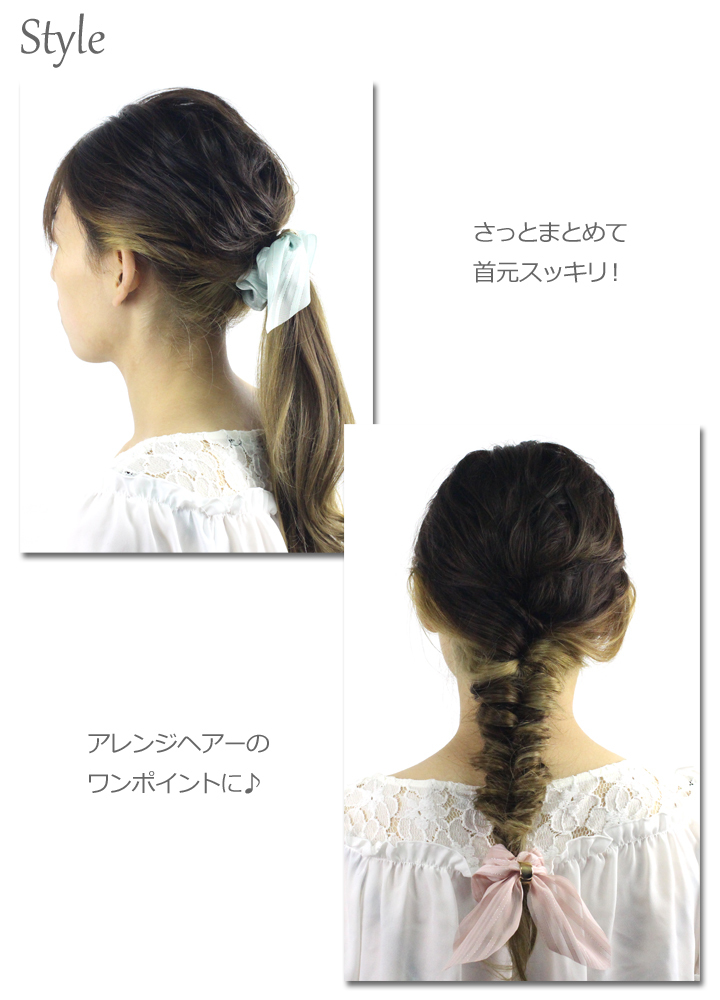 | 商品説明 | 大人気アクセのスカーフリボンシュシュ!! 今までのリボンヘアゴムより更に使いやすくアレンジの幅が広がりました。 ひらひら揺れるリボンが女性らしさをプラス♪ ポニーテールはもちろん、おだんごや編みこみアレンジにも!! |