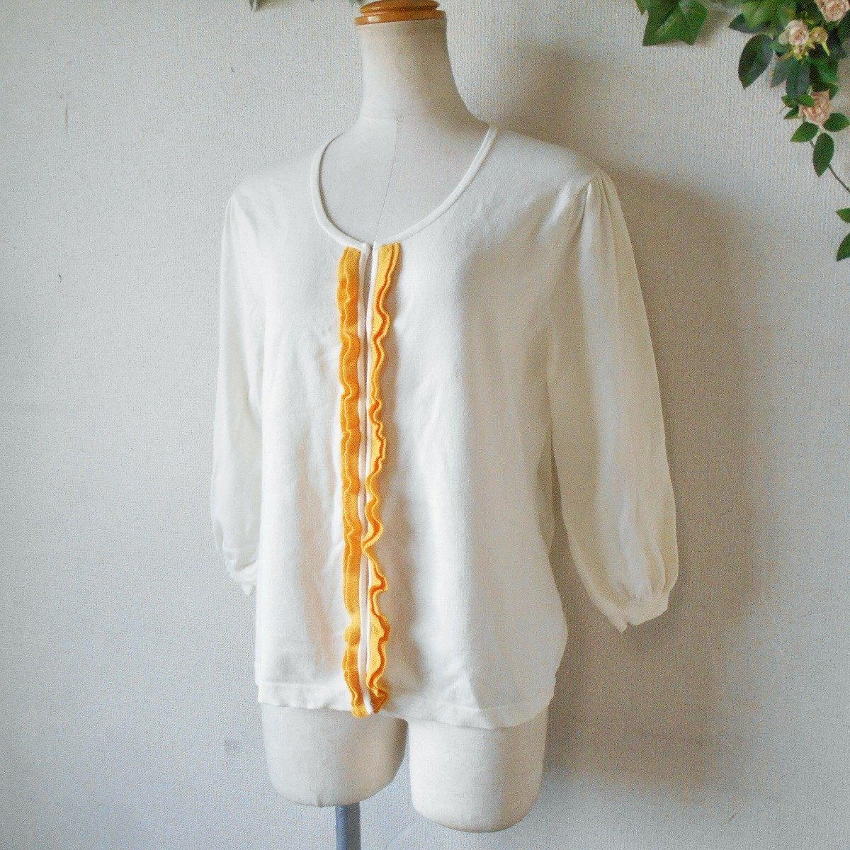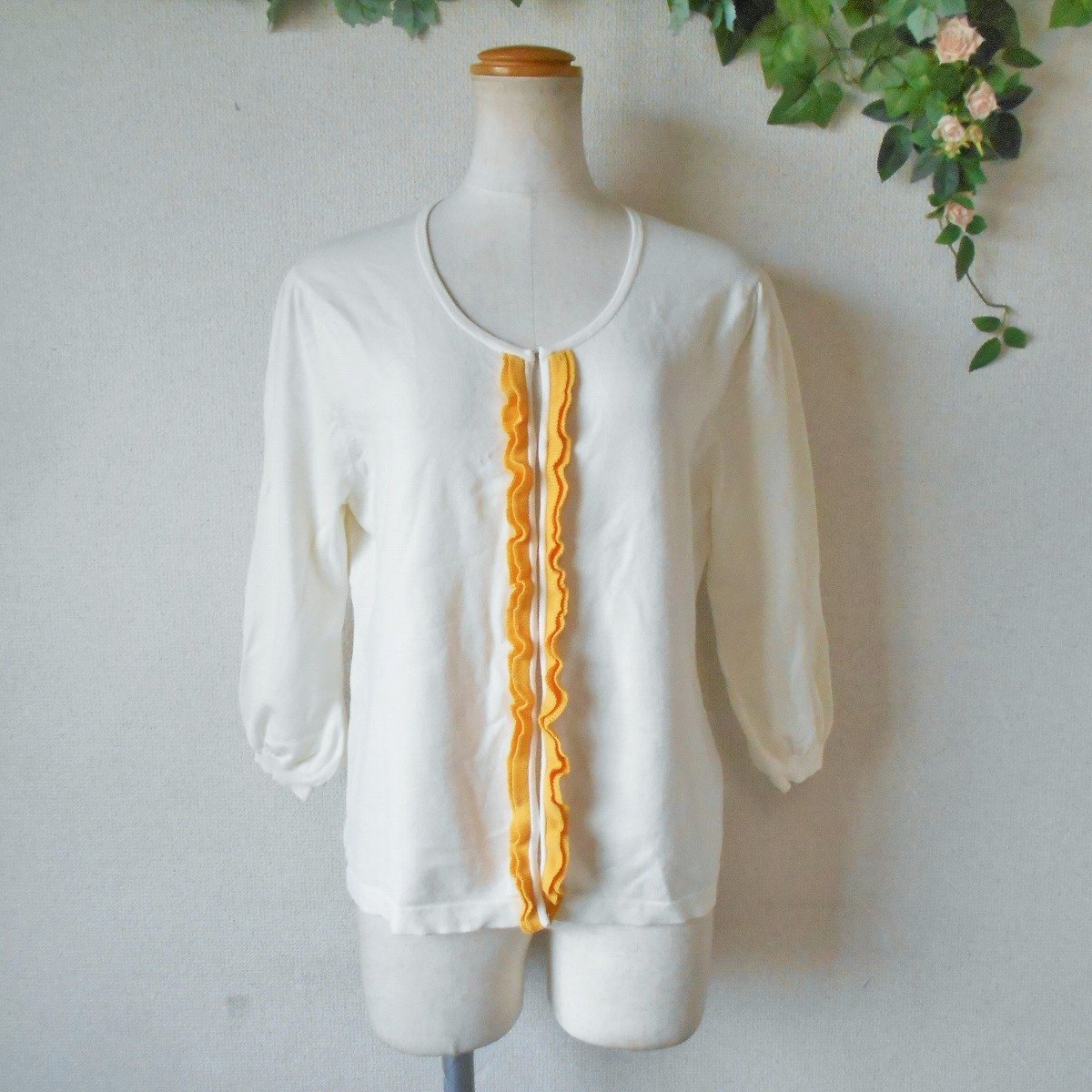 【ポイント】エフデのレディース用7分袖カーディガンになります。お色はアイボリーベースでフリルは濃い黄色になっています。