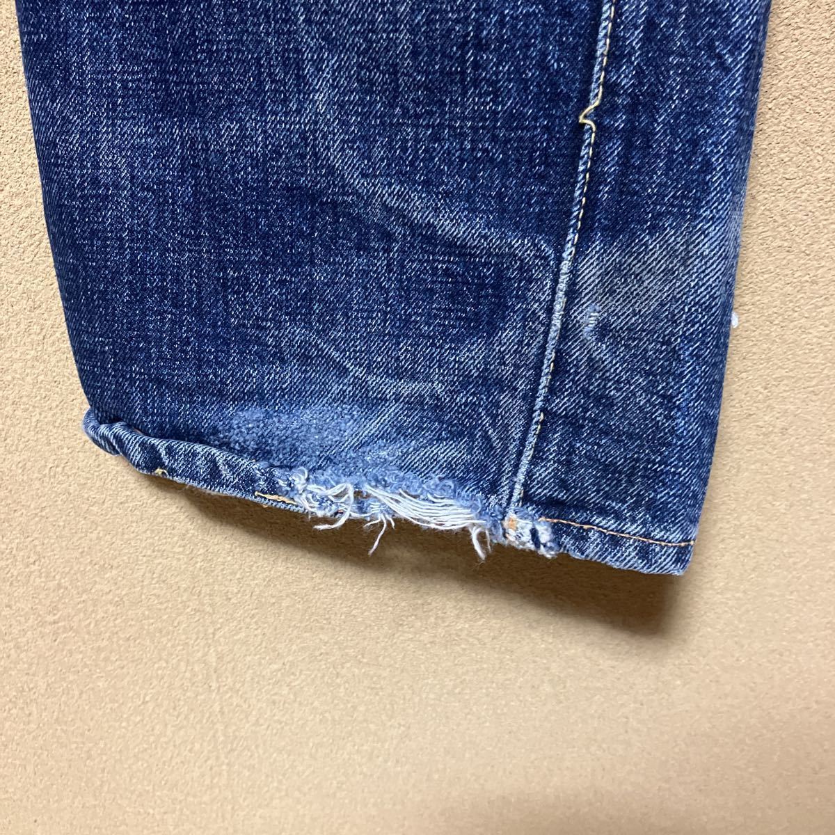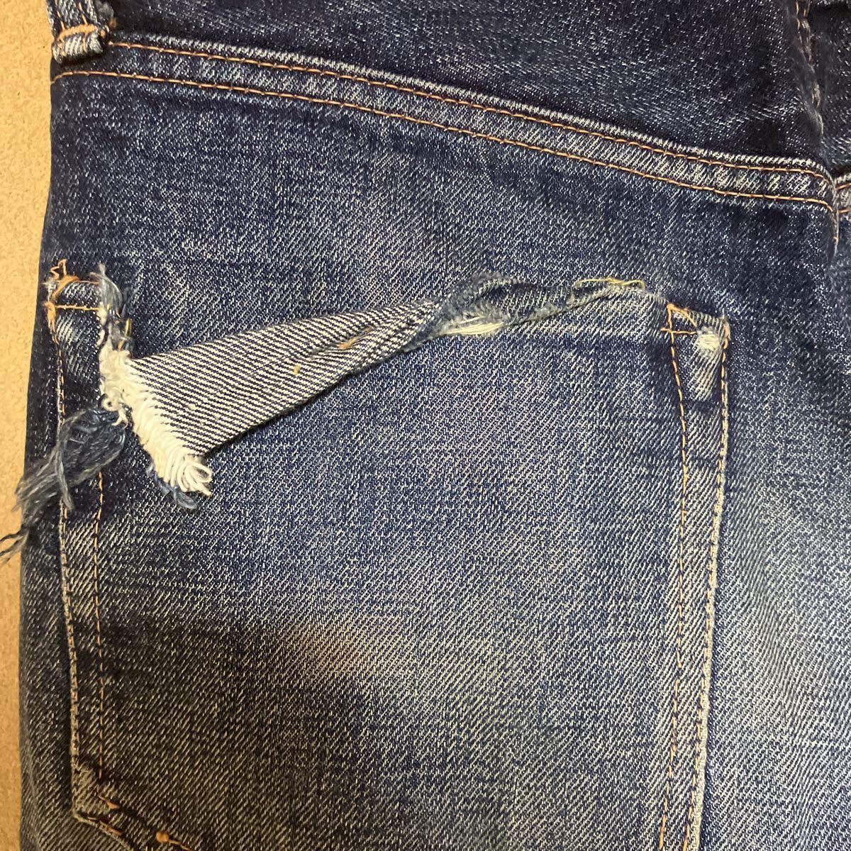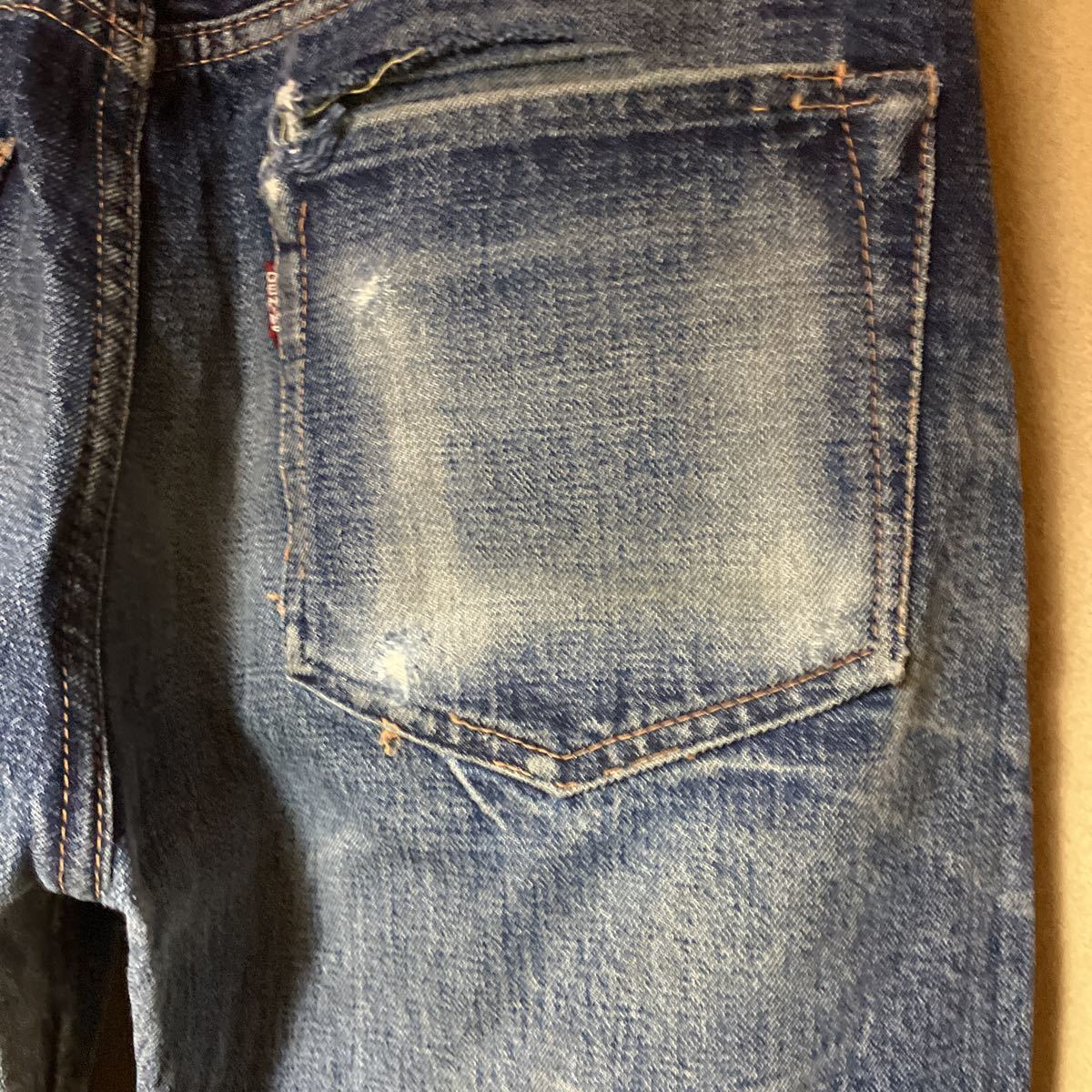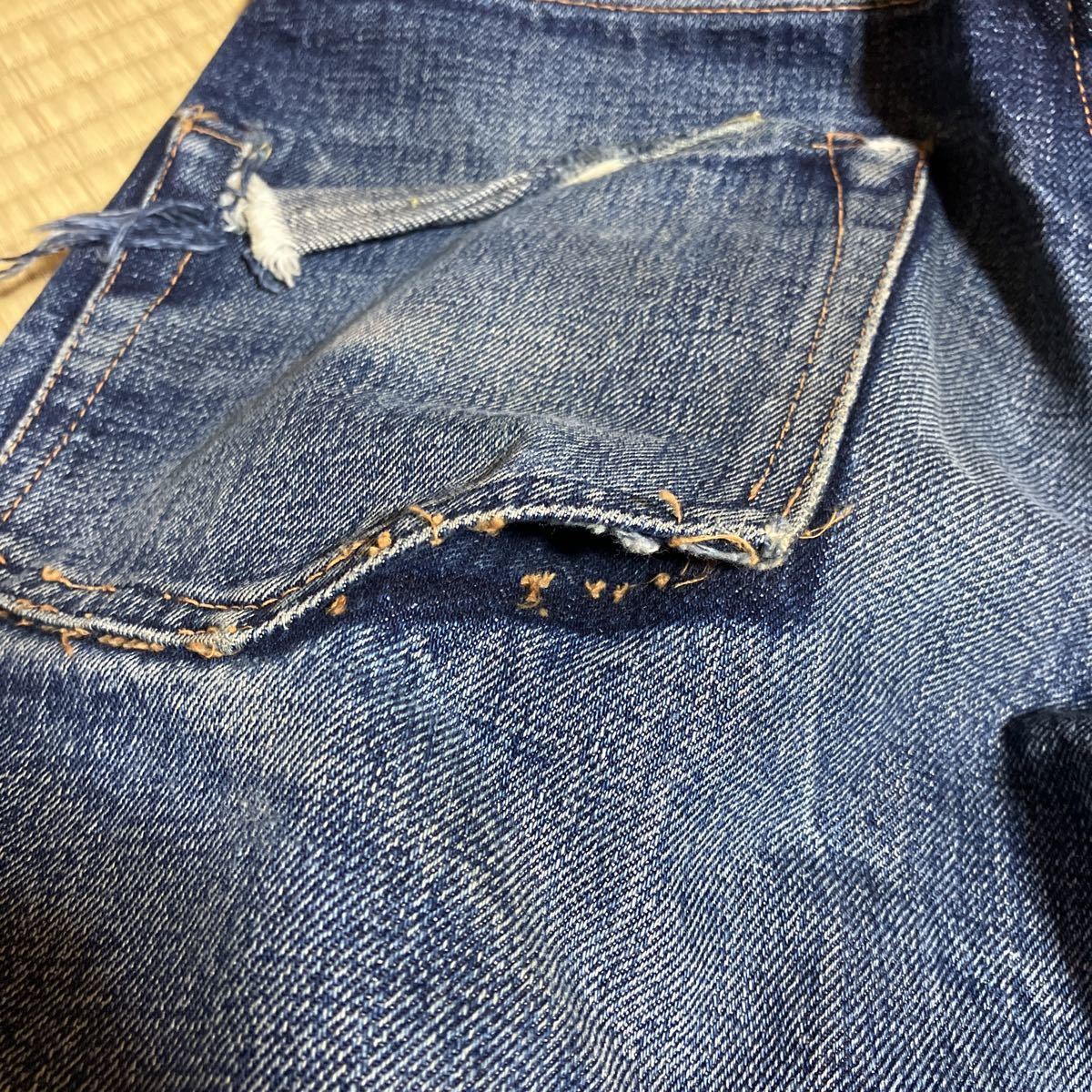着用感や色褪せ、ステッチ飛び、薄汚れ、ボタンホール傷み(穴が大きくなっており抜けやすいです)、ポケット破れ(特に後ろポケットは下に貫通しており物を入れられません。物を通す分には楽しめるかと思います。)、裾破れ、また内タグが見当たらない等ダメージが目立ちますが味として喜んで頂ける方からのご入札をお待ちしております(10が最高の10段階評価で、3)。