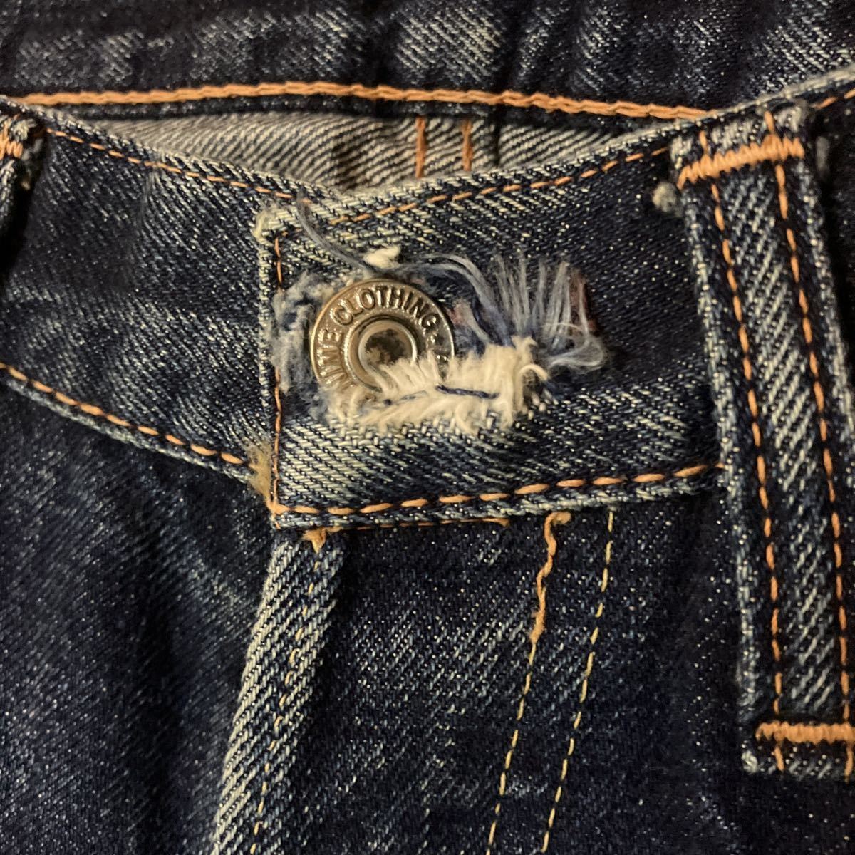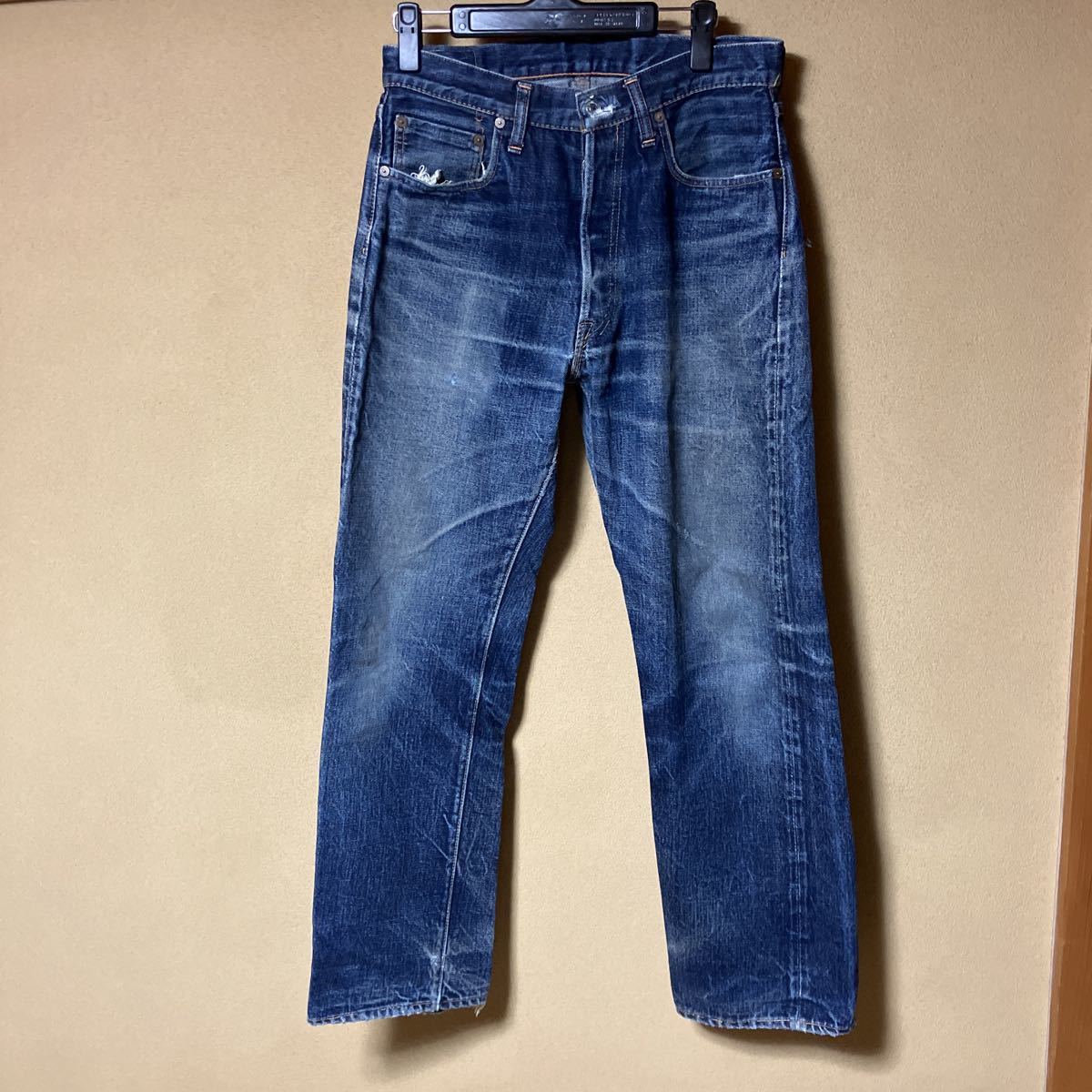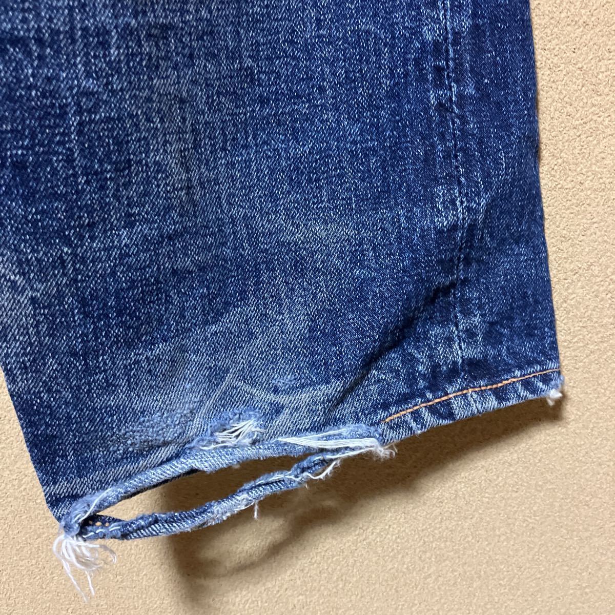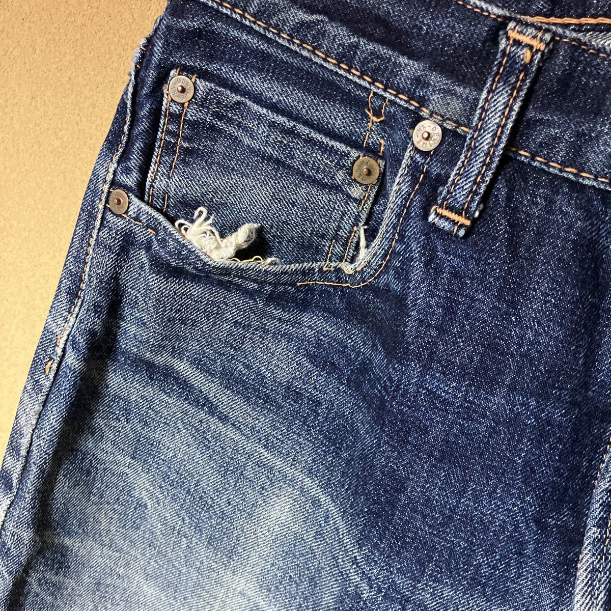 着用感や色褪せ、ステッチ飛び、薄汚れ、ボタンホール傷み(穴が大きくなっており抜けやすいです)、ポケット破れ(特に後ろポケットは下に貫通しており物を入れられません。物を通す分には楽しめるかと思います。)、裾破れ、また内タグが見当たらない等ダメージが目立ちますが味として喜んで頂ける方からのご入札をお待ちしております(10が最高の10段階評価で、3)。