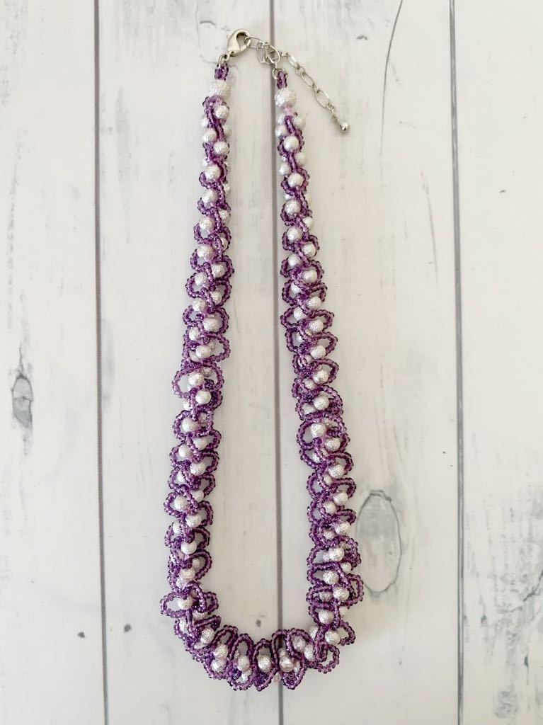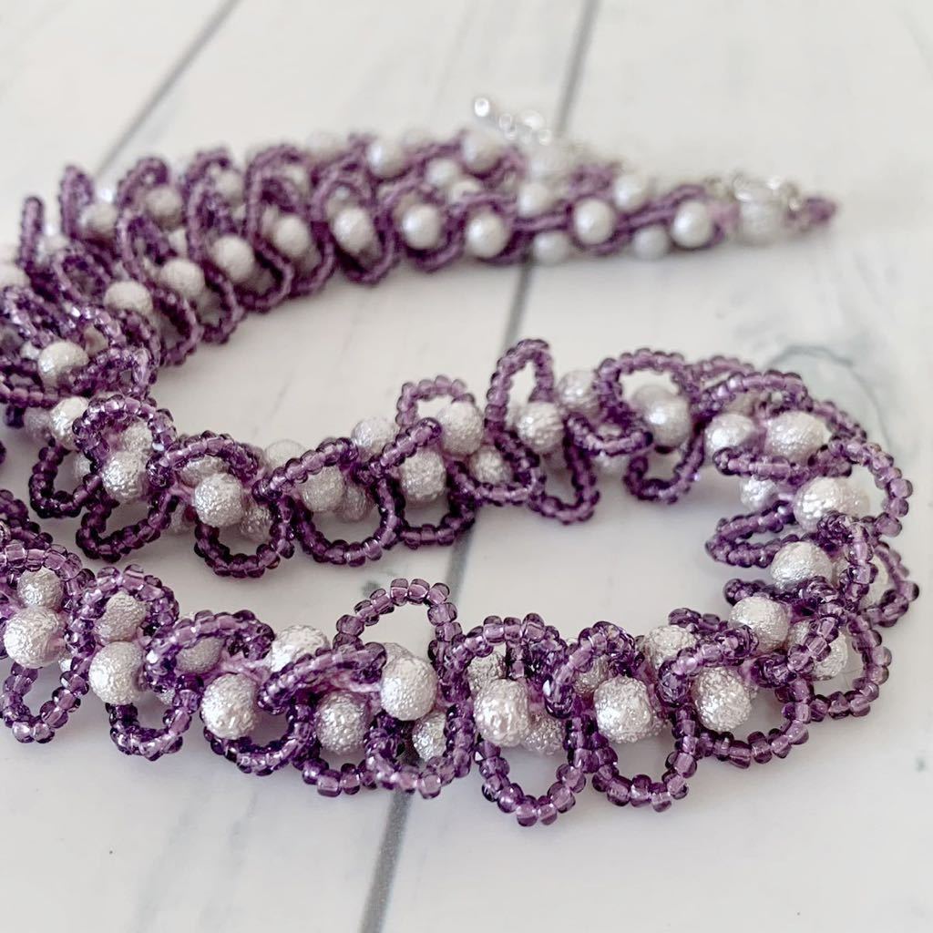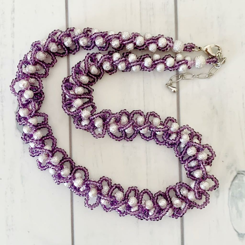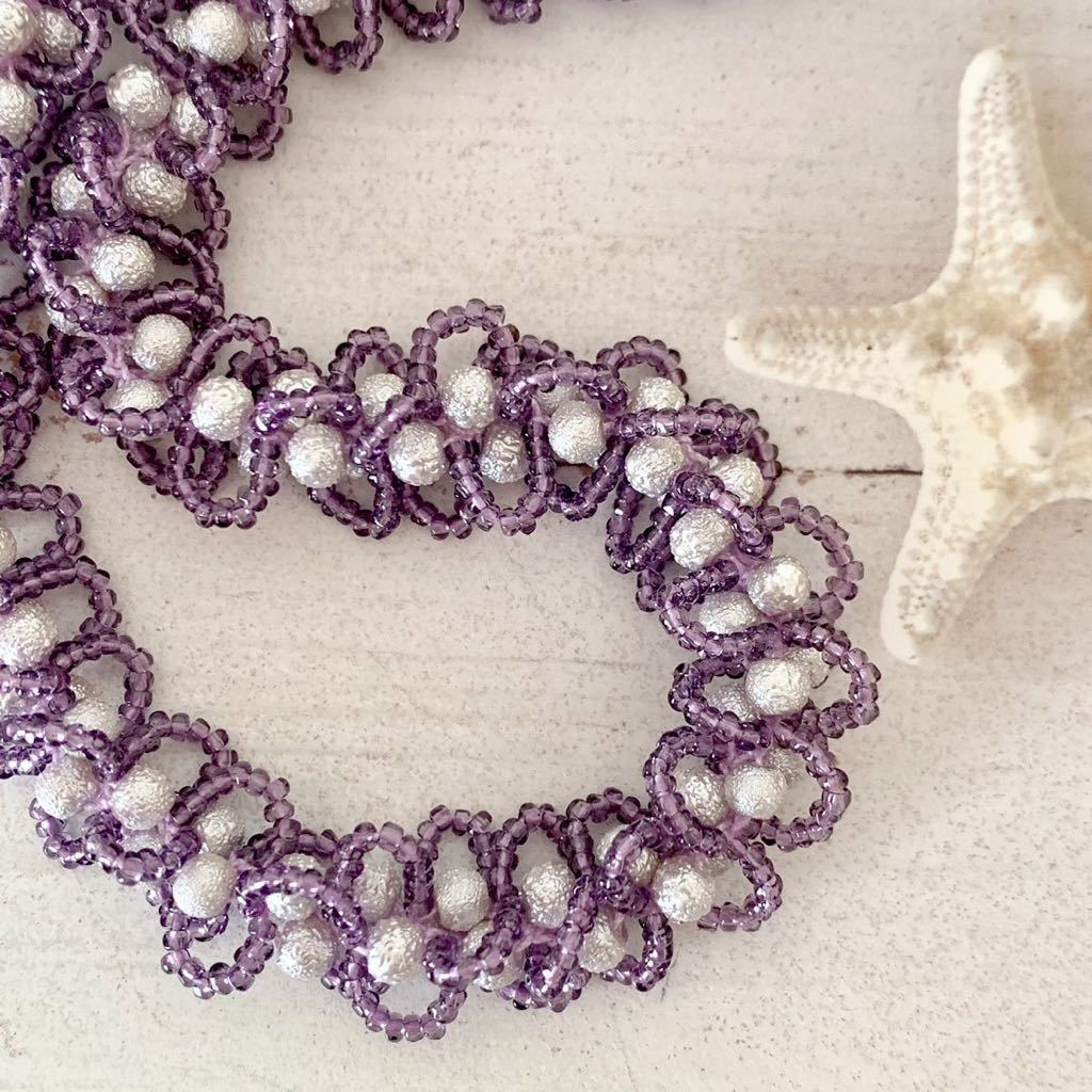 ビーズをレース糸に通し、ひと針ひと針編んで作ったネックレスです。お砂糖をまぶしたようなシュガーパール4㎜とキラキラ輝くスリーカットビーズの組み合わせ。ループがフリルのような大人かわいいデザインです。