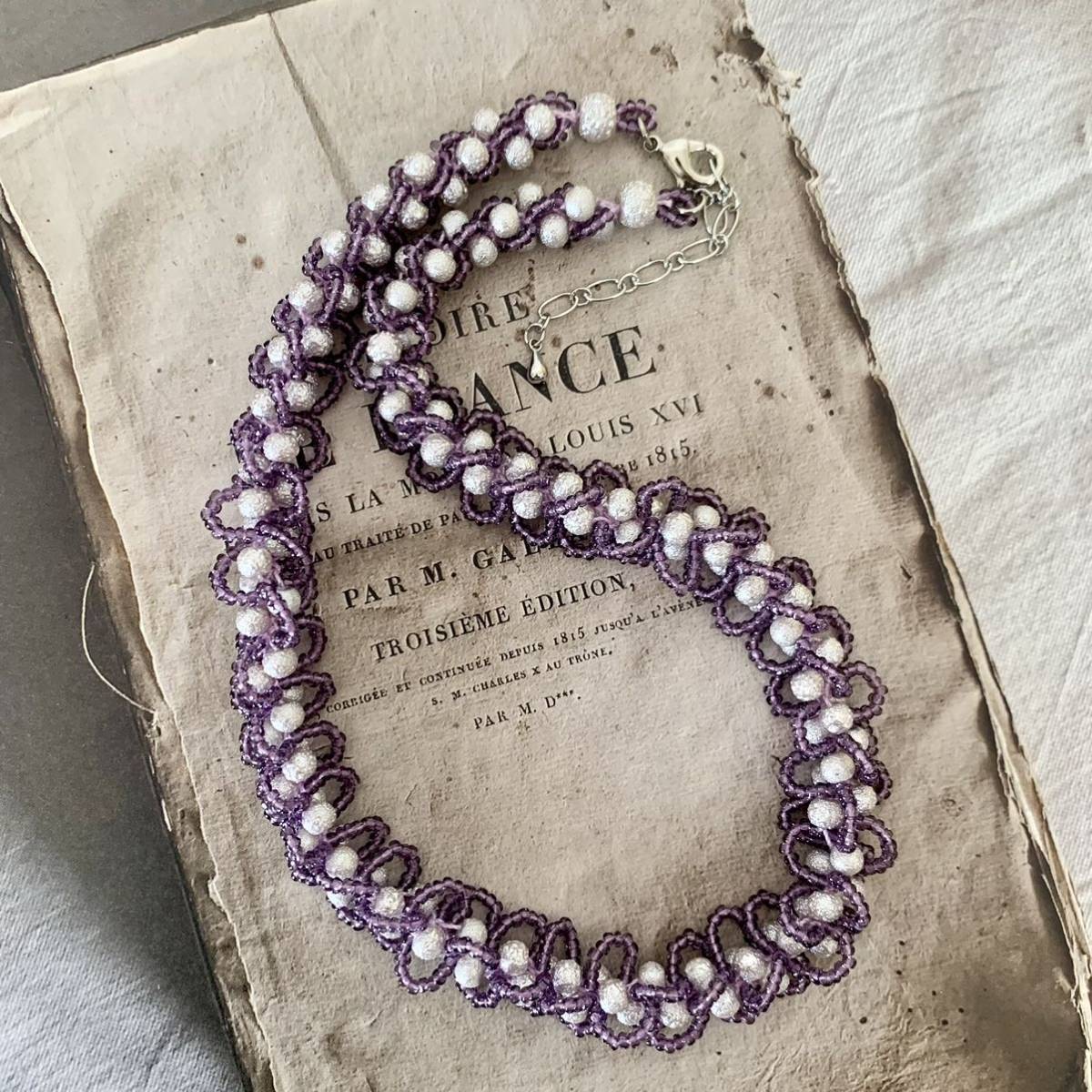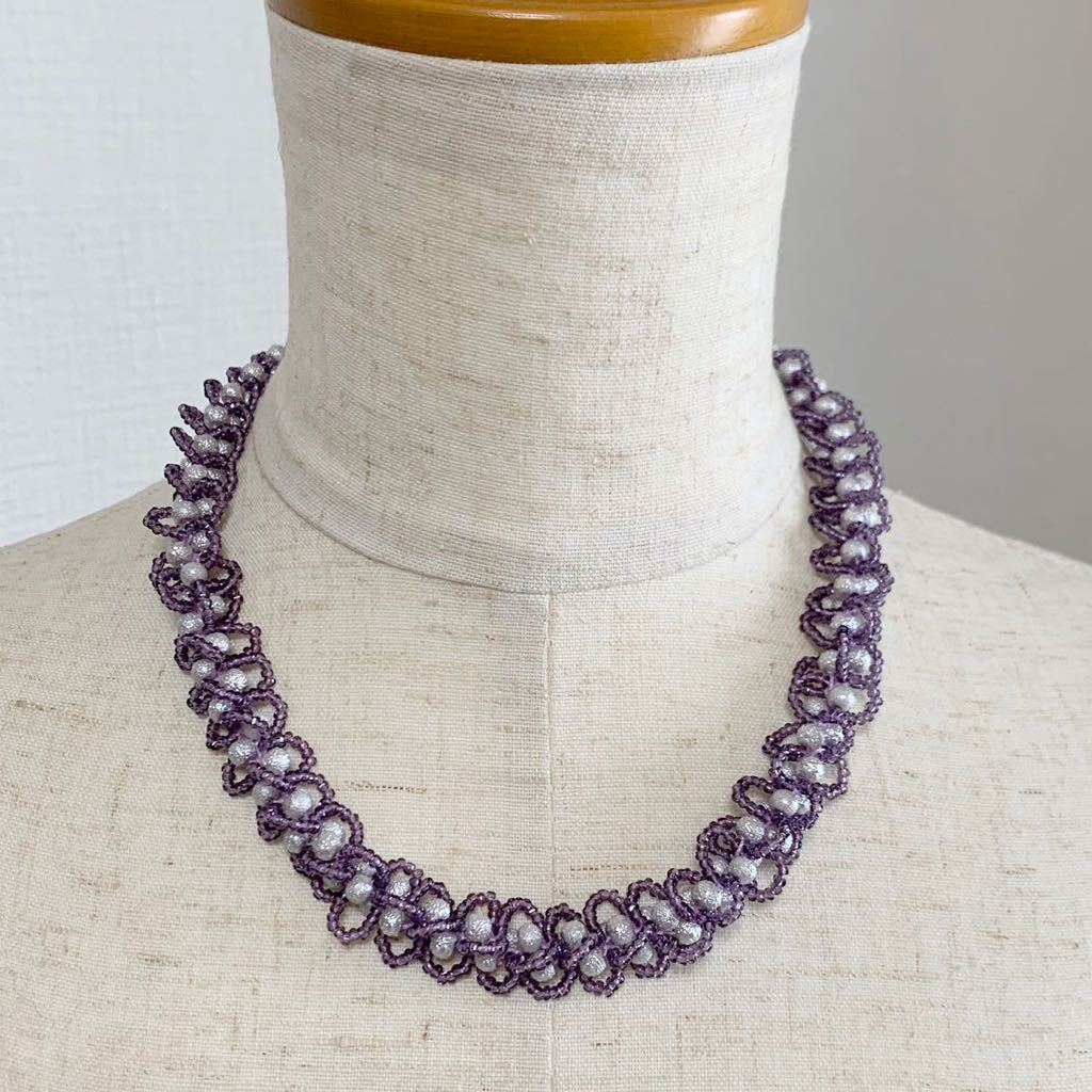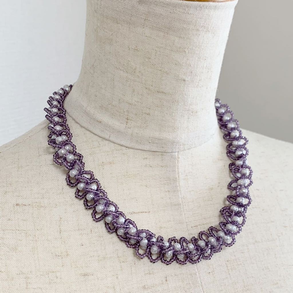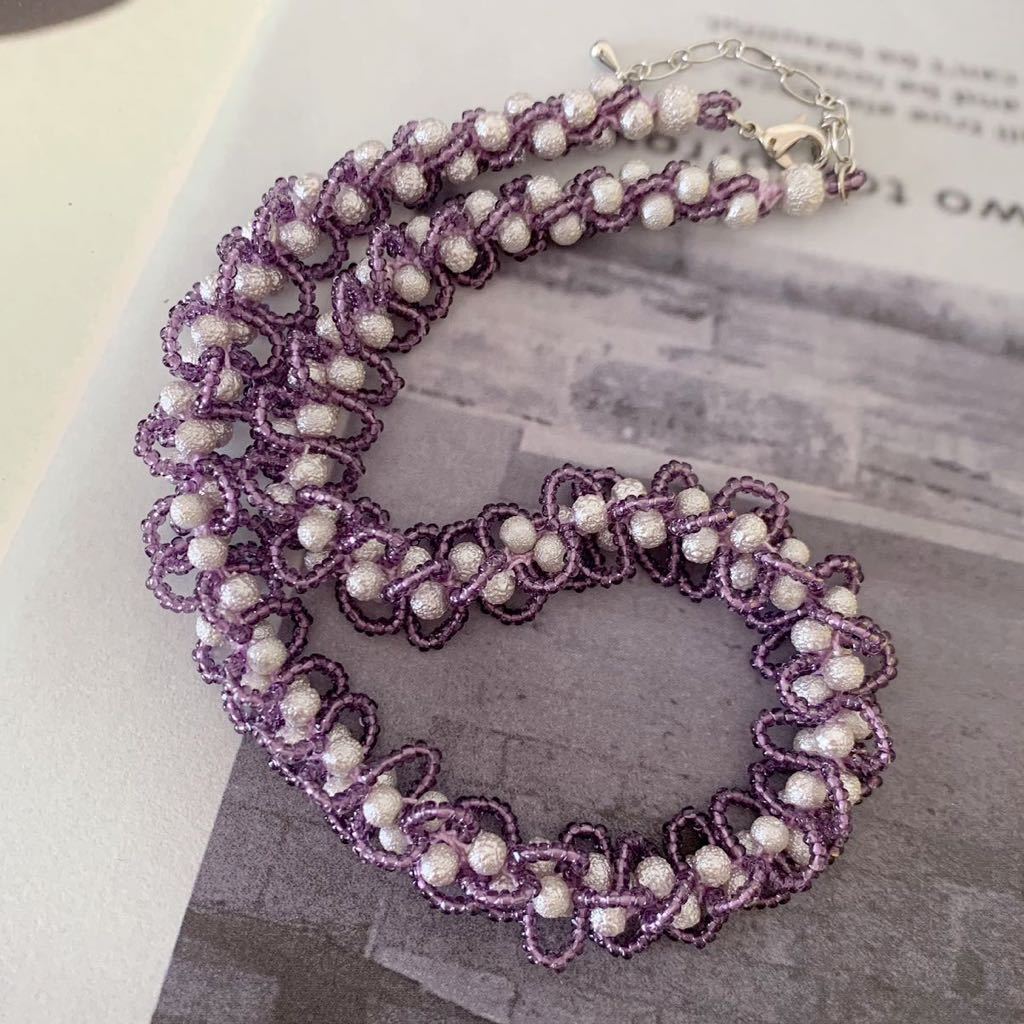 ビーズをレース糸に通し、ひと針ひと針編んで作ったネックレスです。お砂糖をまぶしたようなシュガーパール4㎜とキラキラ輝くスリーカットビーズの組み合わせ。ループがフリルのような大人かわいいデザインです。