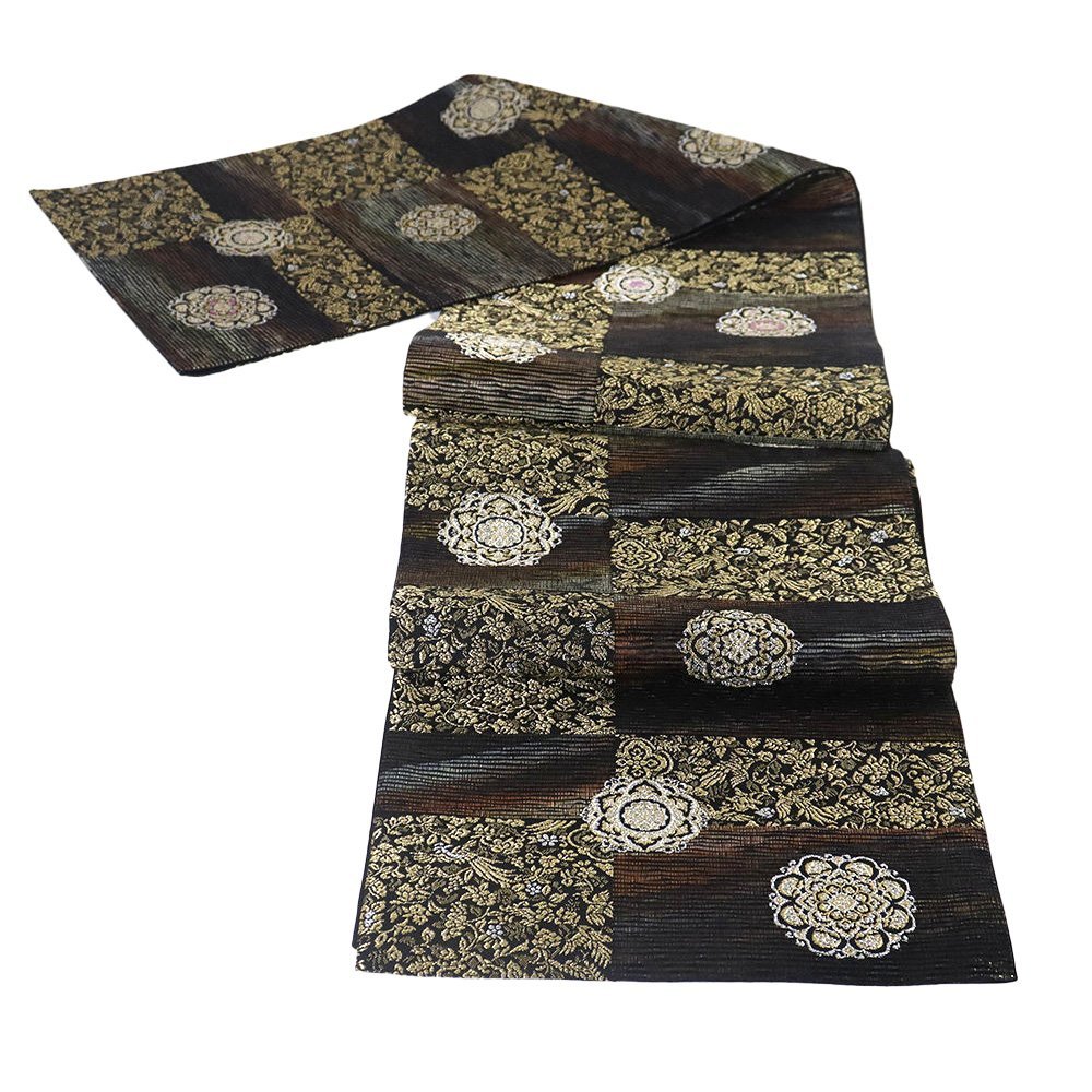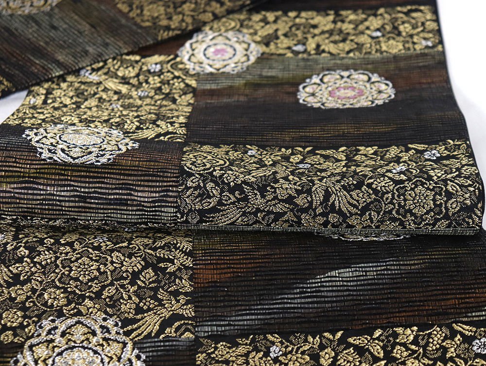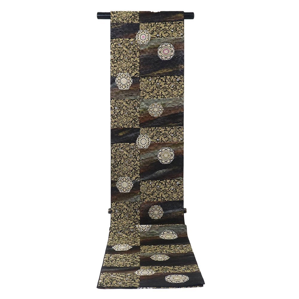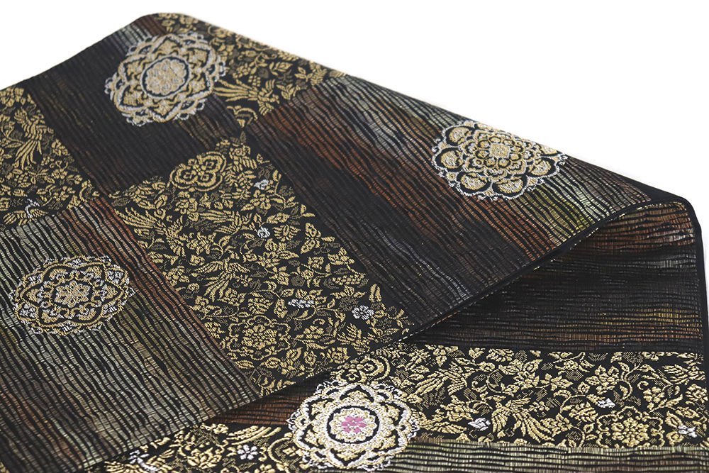 | 西陣織袋帯 古代貝紫 黒・金・茶色・赤・紫地 正倉院文様 段織・葡萄・花喰鳥・華文・格子縞 新品 仕立て上がり | |