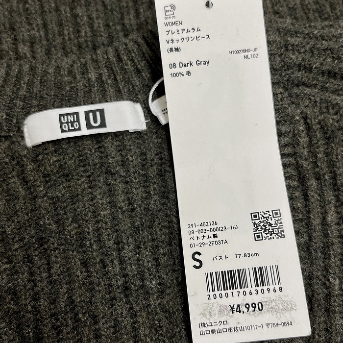| 商品タイトル | ユニクロユー 【新品】 リブニット ロングセーター Vネックワンピース 長袖 プレミアムラムウール100% S ダークグレーカーキ系 レディース |