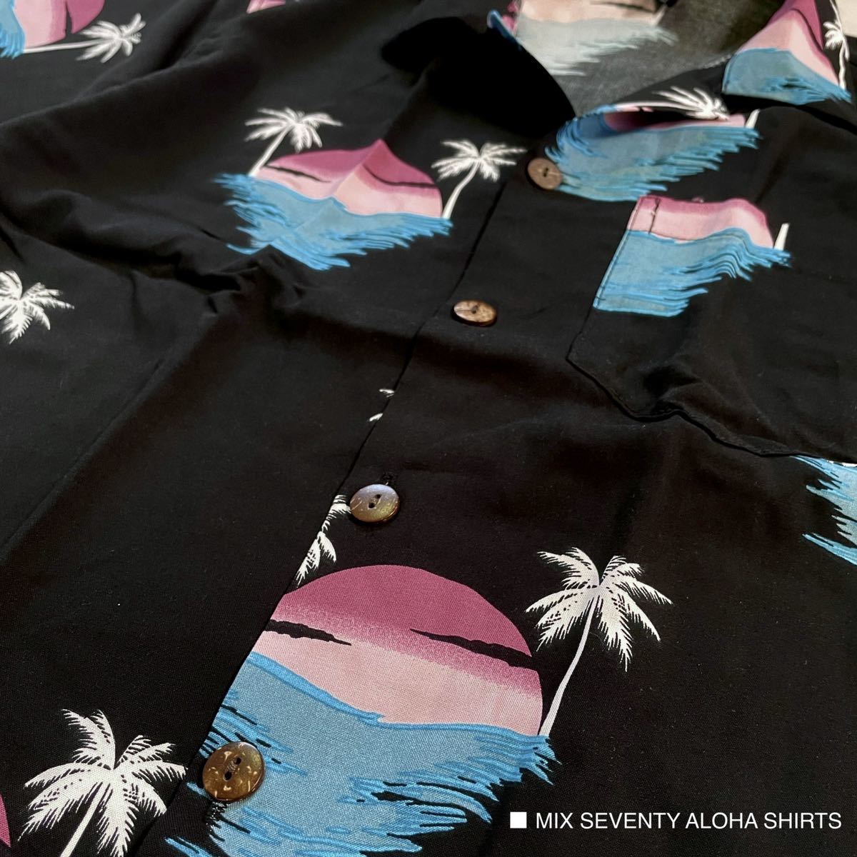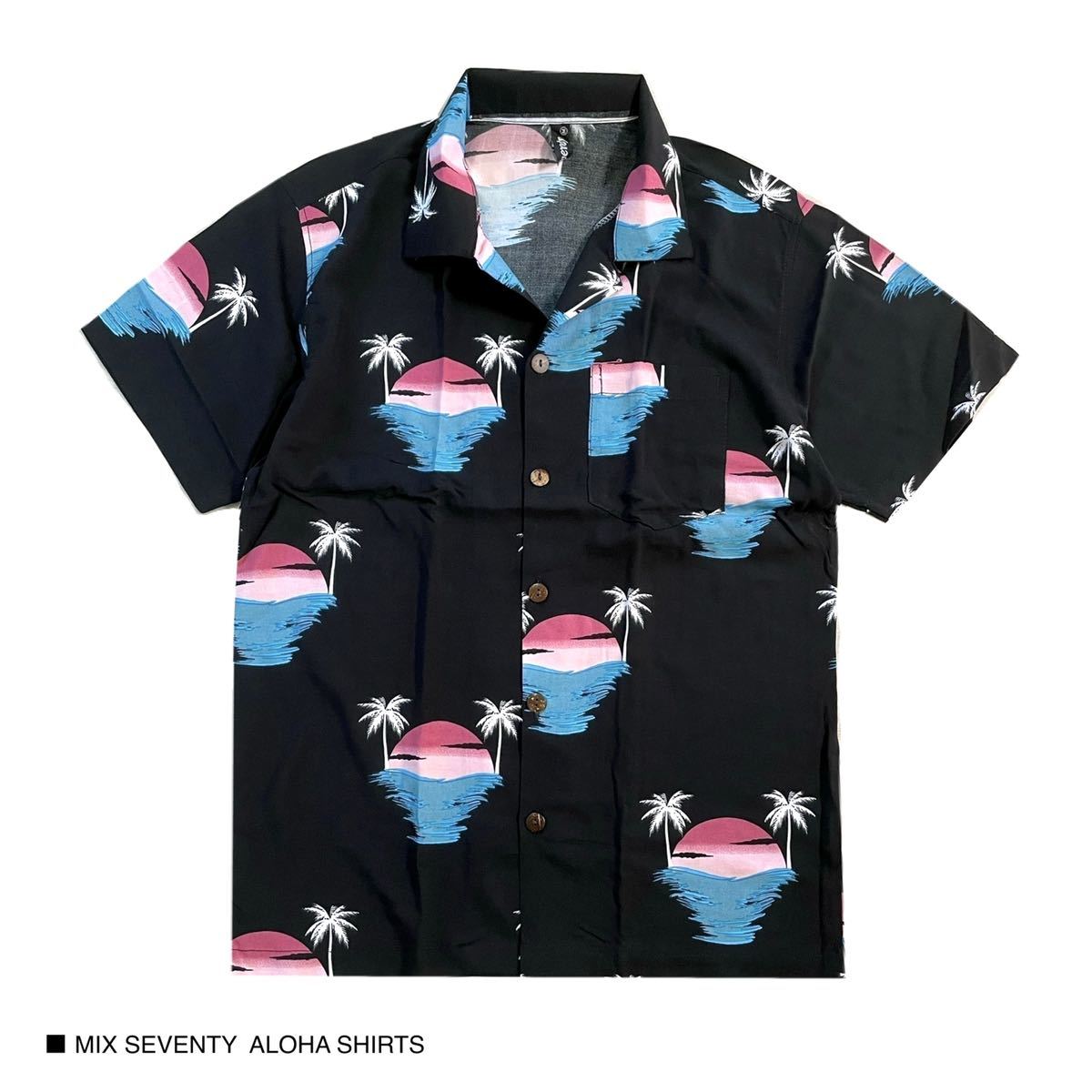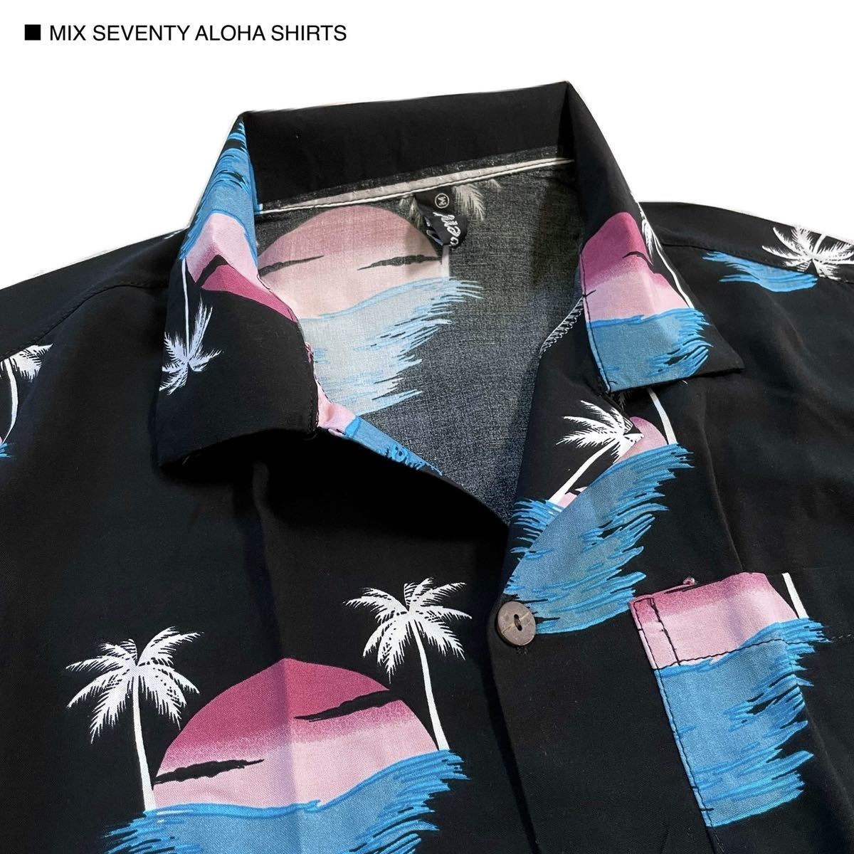 Mix Seventyのビーチ、ヤシと夕日が描かれたアロハシャツ です。