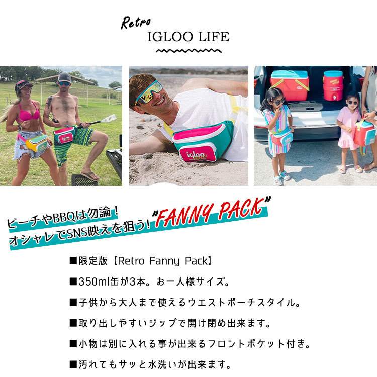 | 仕様 | 子供から大人まで使用できるウエストポーチ。 ウォーキングやSUPなどにも最適。 ・リミテッドエディション「Retro Fanny Pack」 ・子供から大人まで使えるウエストバッグスタイル ・ジップで取り出しやすい開閉スタイル。 ・小物は別に入れることができるフロントポケット付き ・350ml缶3本収納可能。 |