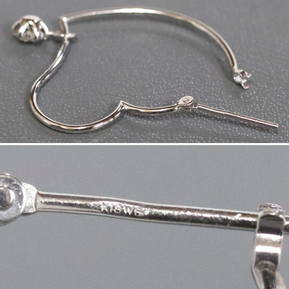 K18WGダイヤモンドピアスの中古品です。 ハート型のような可愛らしいデザインです。 ソーティングが付属します。 クラリティはSI1、カラーはIとJ、カットはFAIRと出ております。 地金に小傷があります。