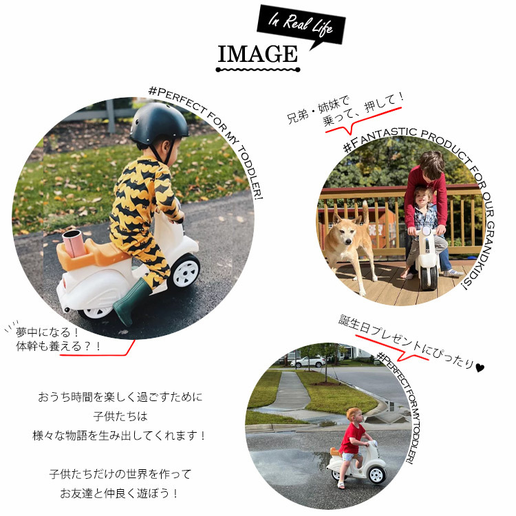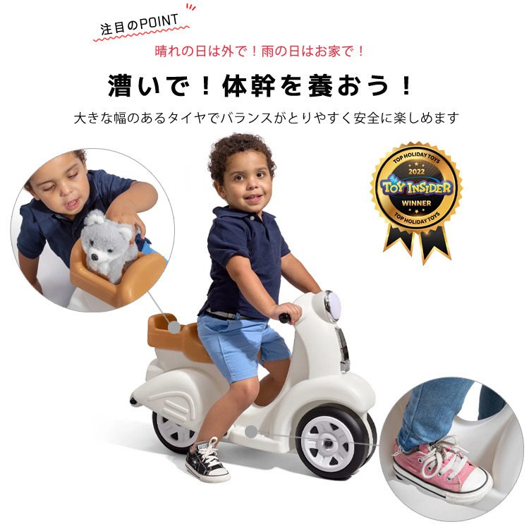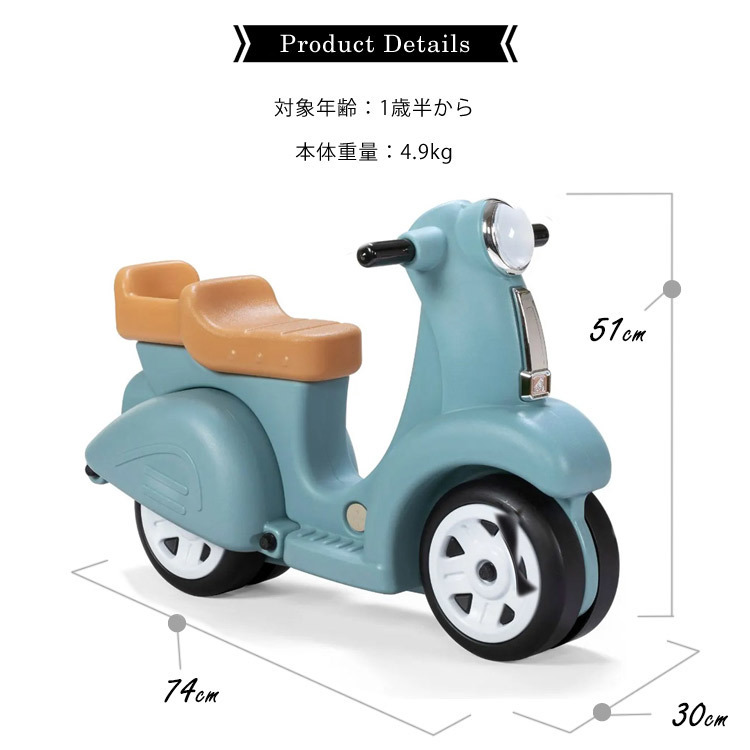 | 仕様 | ・大きな幅のあるタイヤでバランスがとりやすく安全に楽しめます ・前面、背面ともに細部にまでリアルに作られています。 ・握りやすいハンドルで楽な姿勢で楽しめます。 |