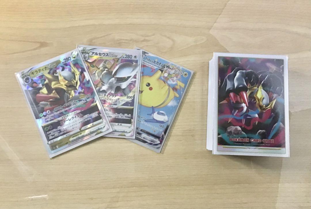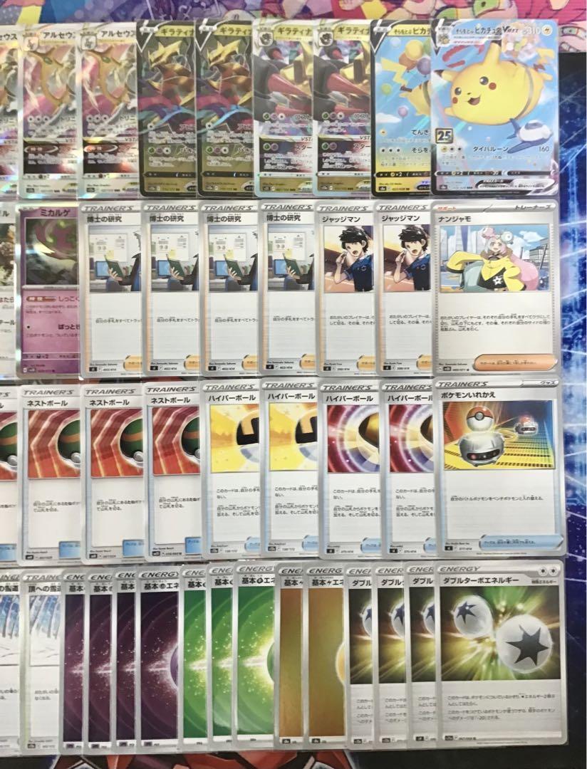 ☆本格構築のアルセウスギラティナVstarデッキ ◆アルセウスVのエネルギー加速とスターバースにギラティナVのロストインパクトにピカチュウVのダイバルーンを組み合わせた環境上位構築 ◆多くのポケモンの特性や能力と各種ボール、サポートをフル活用してどんな相手にも有利な状況を作り出せます。 ◆各種ポケモンから特殊エネルギーまで必須、相性の良いパーツを採用しています。 ☆ギラティナスリーブにオーバースリーブをつけた実戦仕様の二重スリーブです。 ■ポケモン 4枚 アルセウスV 3枚 アルセウスVstar 2枚 ギラティナV 2枚 ギラティナVstar 1枚 そらをとぶピカチュウV 1枚 そらをとぶピカチュウVstar 1枚 イキリンコex 2枚 ビッパ 2枚 ビーダル 1枚 ミカルゲ ■サポート 4枚 博士の研究 2枚 ジャッジマン 2枚 ナンジャモ 2枚 ボスの指令 1枚 チェレンの気くばり ■グッズ 4枚 ネストボール 4枚 ハイパーボール 2枚 ポケモンいれかえ 1枚 ともだちてちょう 1枚 ロストスイーパー 1枚 すごいつりざお 1枚 あなぬけのヒモ ■スタジアム&エネルギー 3枚 頂への雪道 4枚 基本超エネルギー 3枚 基本草エネルギー 2枚 基本雷エネルギー 4枚 ダブルターボエネルギー