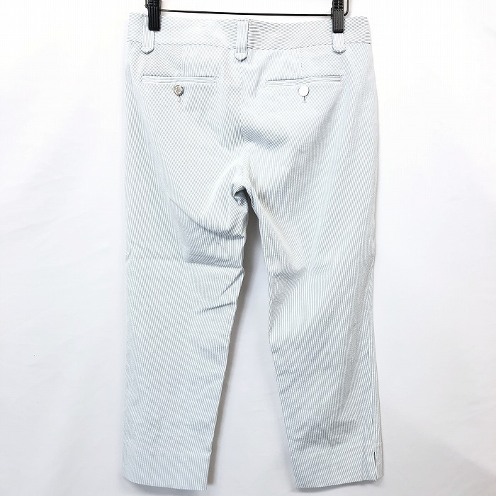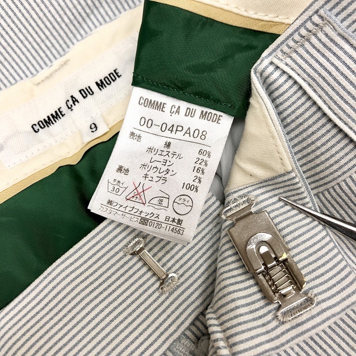 商品タイトル | COMME CA DU MODE コムサデモード 9 レディース 若干薄手 クレープパンツ キュプラ裏地 ストライプ センターライン 裾スリット ブルー系 |