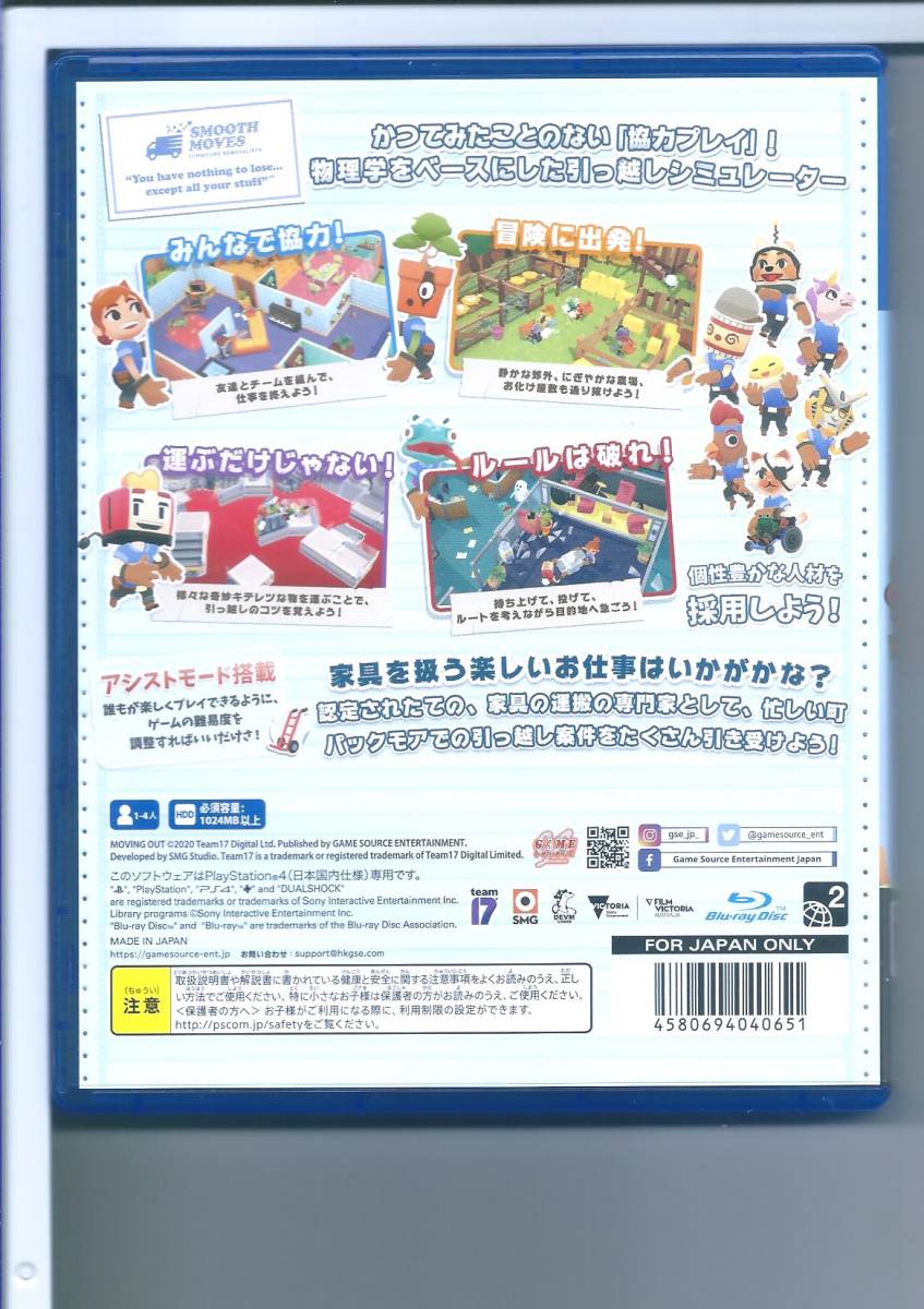 ●JANコード4580694040651 t1 ☆PS4 Moving Out ムービングアウト 初回特典ステッカー付き ●商品の状態 ソフトは使用感少なく状態良好ですが、ケースにスレ・イタミがあります。説明書がないのは仕様です。初回特典ステッカー(未開封)付きです。 |