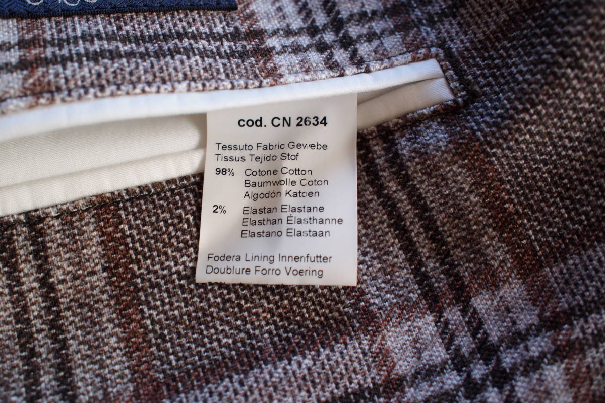 コットン混 ピケ調 、ダークベージュ系 ホップサック調織柄 グレンチェック 、ジャージーアンコンジャケット 、50サイズ(日本向けL~XLサイズ相当)。