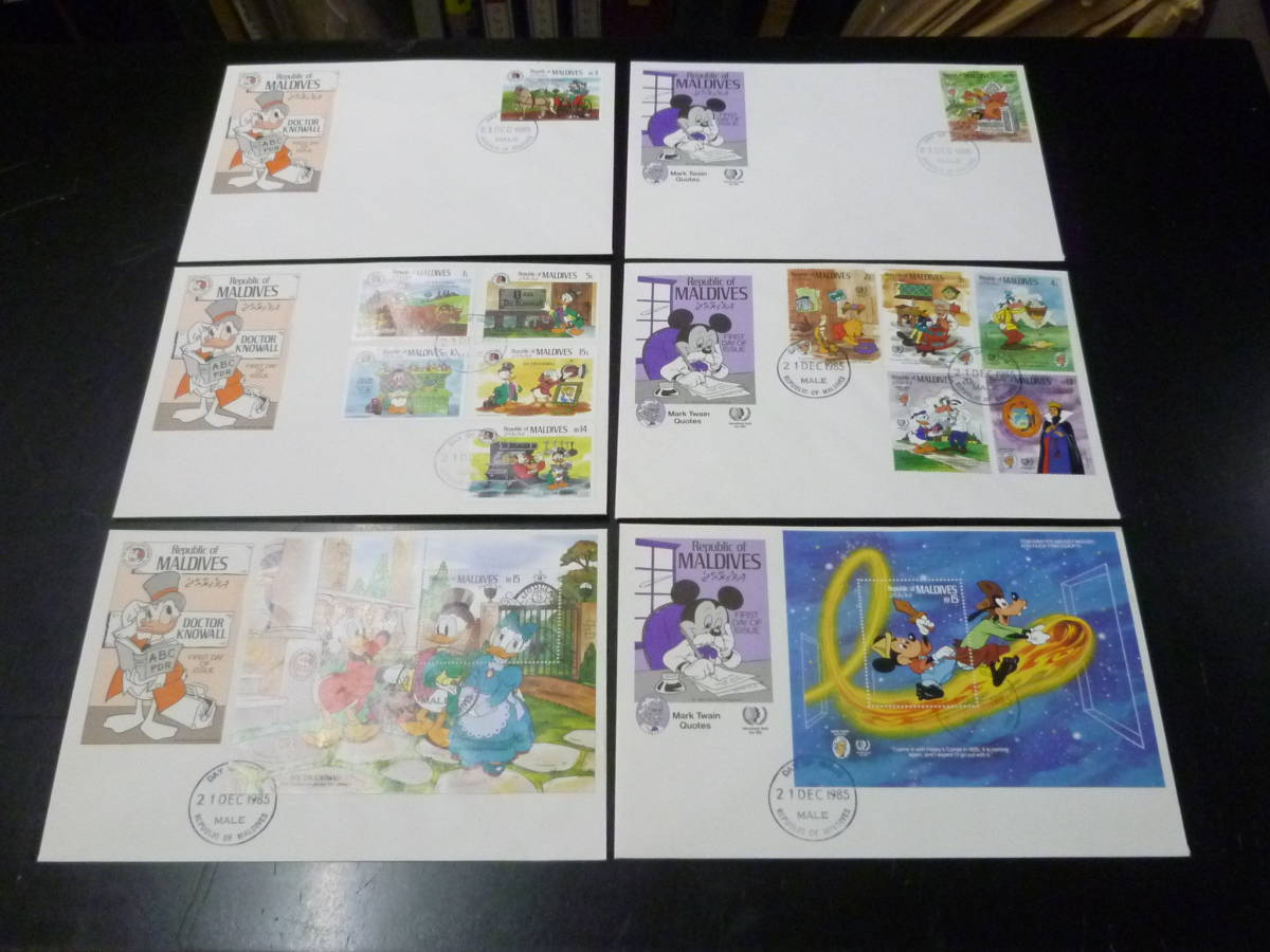 23L P №7 ディズニー切手FDC 1985年 モルジブ グリム兄弟生誕200年・他 各完揃 2シリーズ 計6通
