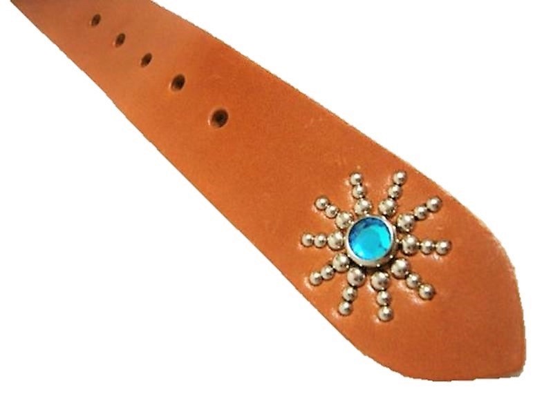 スタッズはアメリカで100年以上の歴史を誇るスタンダードリベット社製の二つ爪ラウンドヘッドスポッツとアクリルカラースポッツ(アクアブルー)を使用しています。