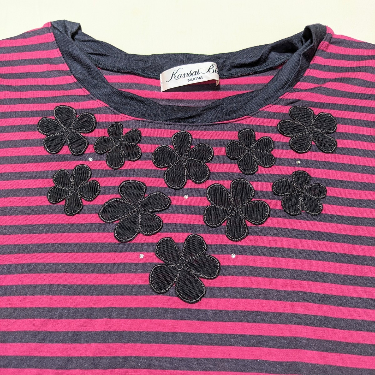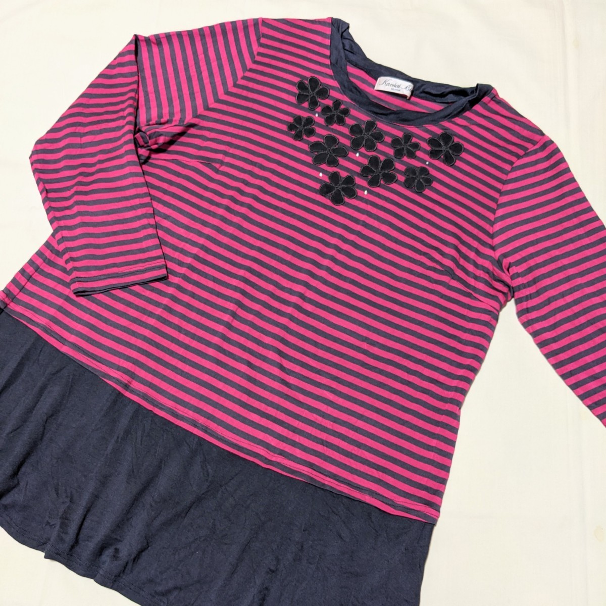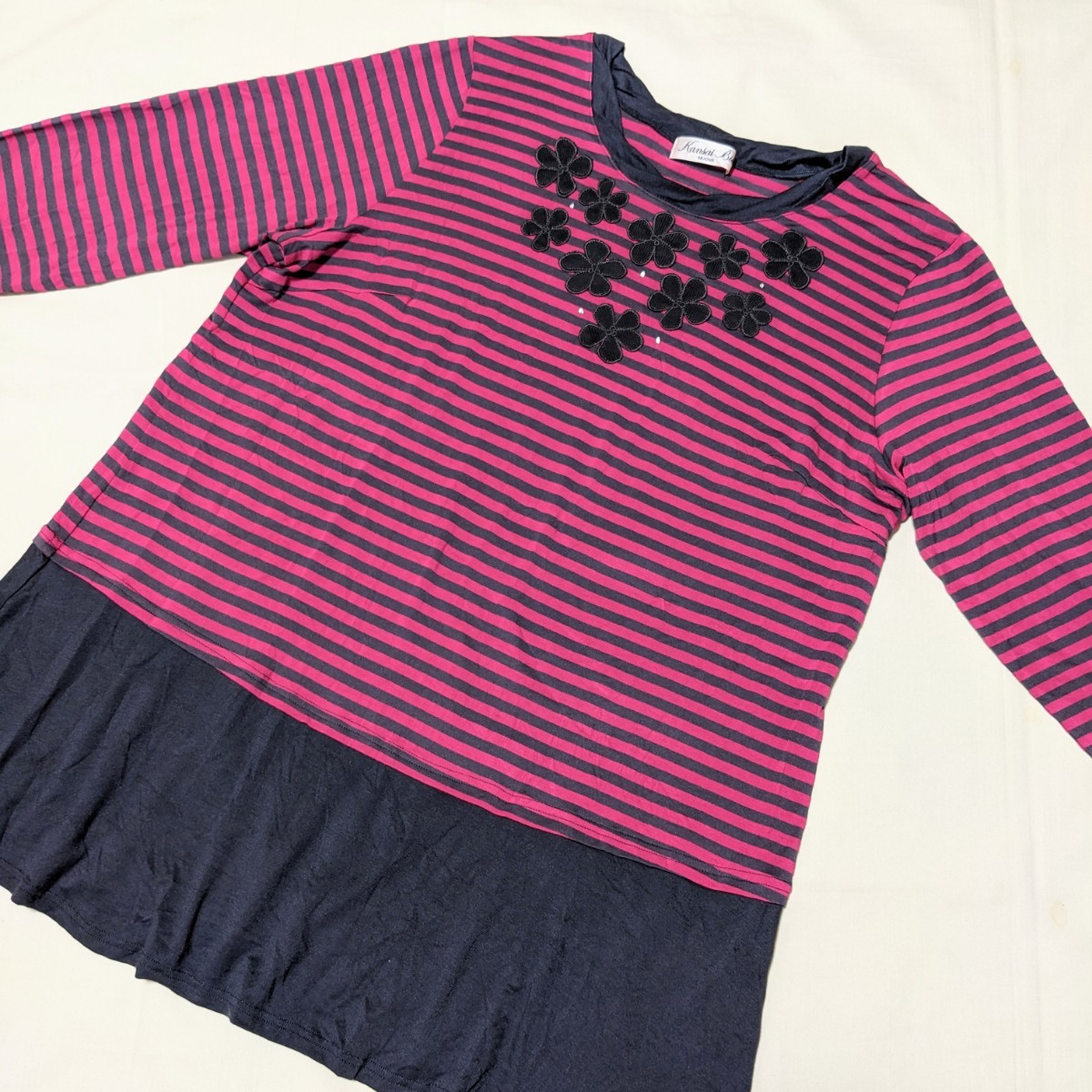 濃い目のピンクとグレーのボーダー柄のカットソーです。