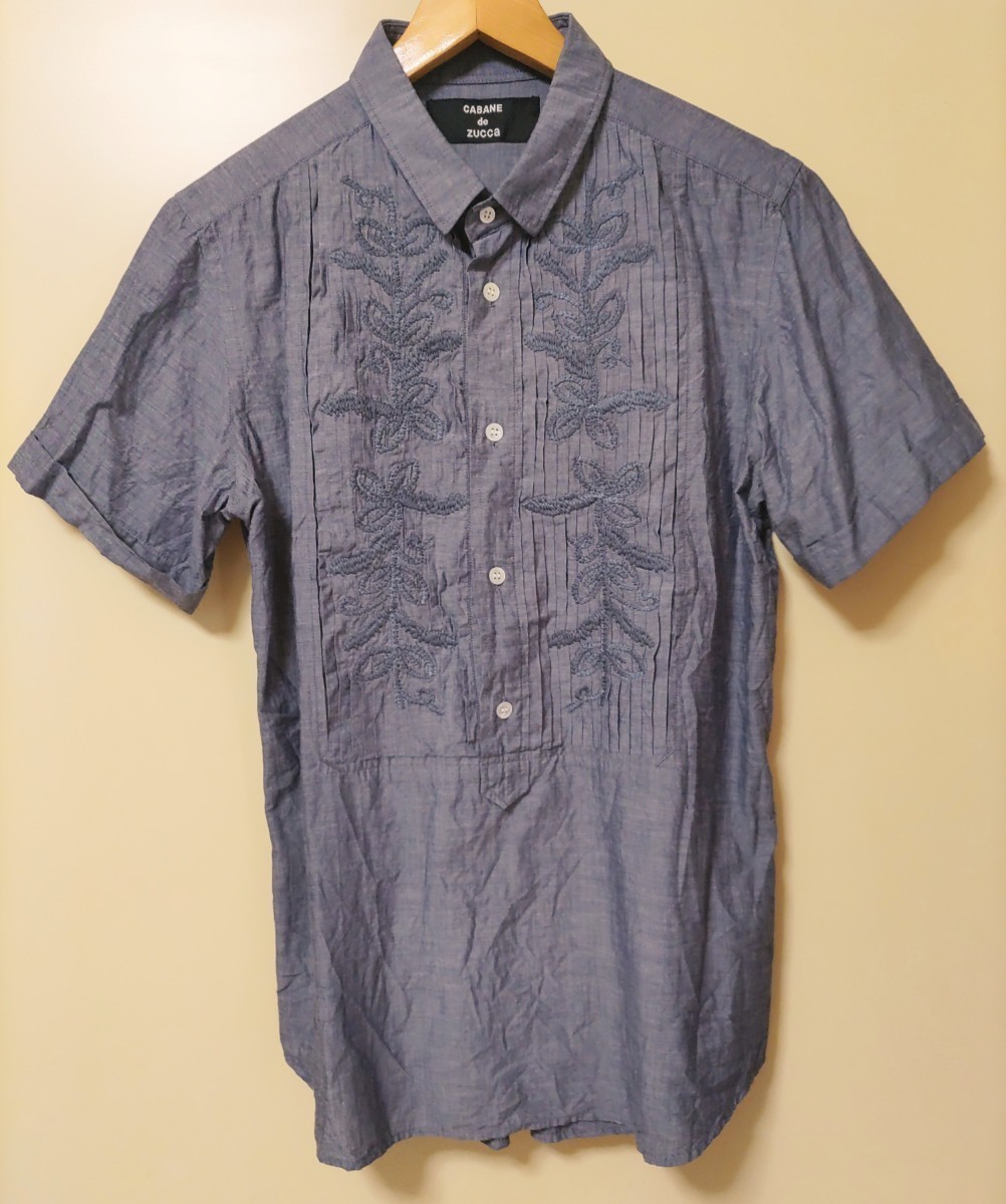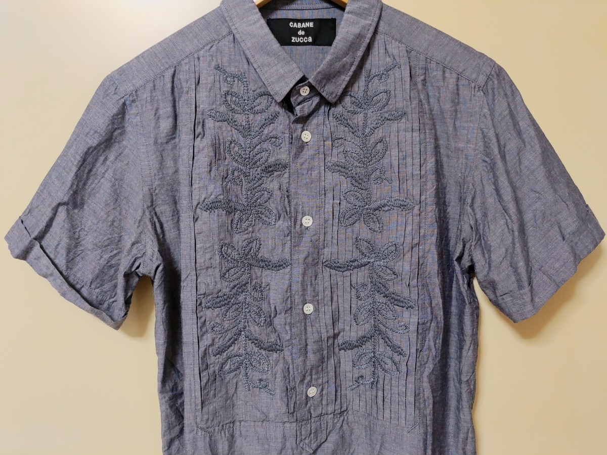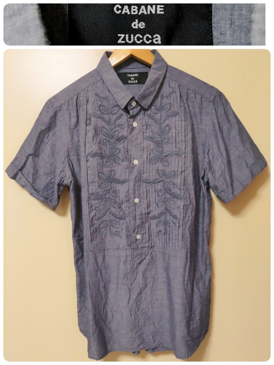 カバンドズッカSプルオーバーシャツCABANE de ZUCCA刺繍 ズッカ 半袖シャツ 日本製 プリーツ ボタニカル ブルー グレー ブロード 綿100%