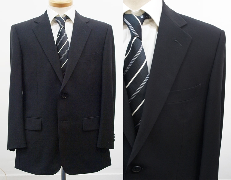 【サイズ】 BB5 (BE5 BBM号相当) 目安の体型 身長165cm~175cm、ウエストサイズ84cm~98cm前後(アジャスターにて可動) 【ジャケット実寸】 肩幅49cm 着丈74cm 袖丈59.5cm 脇下部分57cm 身幅54cm 【パンツ実寸】 ウエスト(胴回り実寸)最小84cm~最大98cm わたり幅36.5cm 股下から10cm下の部分32.5cm 裾幅23cm 脇股上27.5cm 前股上31cm 股下90cm(裾上げしていない状態/新品) 【デザイン】 ・ゆとりのある着用感のシングル2つボタン、レギュラータイプ、冠婚葬祭用ブラックフォーマルスーツ、新品、裾上げしていない状態です。 ・ジャケットはシングル2つボタンでレギュラーモデル ・パンツはウエストアジャスター付きでほどよいゆとりがあるワンタック、レギュラースラックスです。 ・上着の裏地はファスナーで取り外し可能で、付けていると総裏地になり、外した場合はメッシュ素材の背抜き仕立てになります。 【仕様】 ・ジャケットはシングル2つボタン、ノッチドラペル、袖口ボタン4つ、サイドベンツ、裏地を外した場合/内ポケット3つ(小ポケット1つ含む)、裏地を付けた場合/内ポケット1つ、オールシーズン ・パンツはワンタック、膝裏当て付き、脇ポケット斜め付け、後ろポケット左のみボタン付き、フロントはファスナーでホック仕様、スライドアジャスター付き 細部にわたりきちんとした縫製仕様の礼服、フォーマルスーツです。 【素材】 表地:ウール60% レーヨン40% 裏地:胴裏/ポリエステル100% 袖裏/キュプラ100% 【色】 黒色 【柄】 無地 ・盛夏には少し厚手ですが適度な厚みの紳士礼服スーツ用、真黒ブラック素材を使用。 ・普通のスーツ用ウール生地と比べるととろっとした感じで柔らかい風合いです。 濃染加工の真黒できちんとしたブラックフォーマル素材を使用致しております。 ・オールシーズン対応商品です。