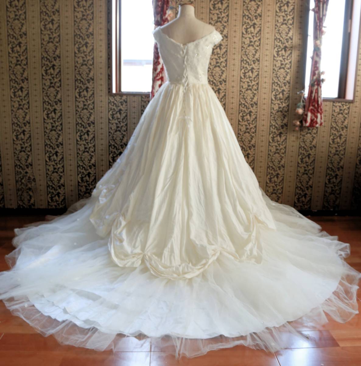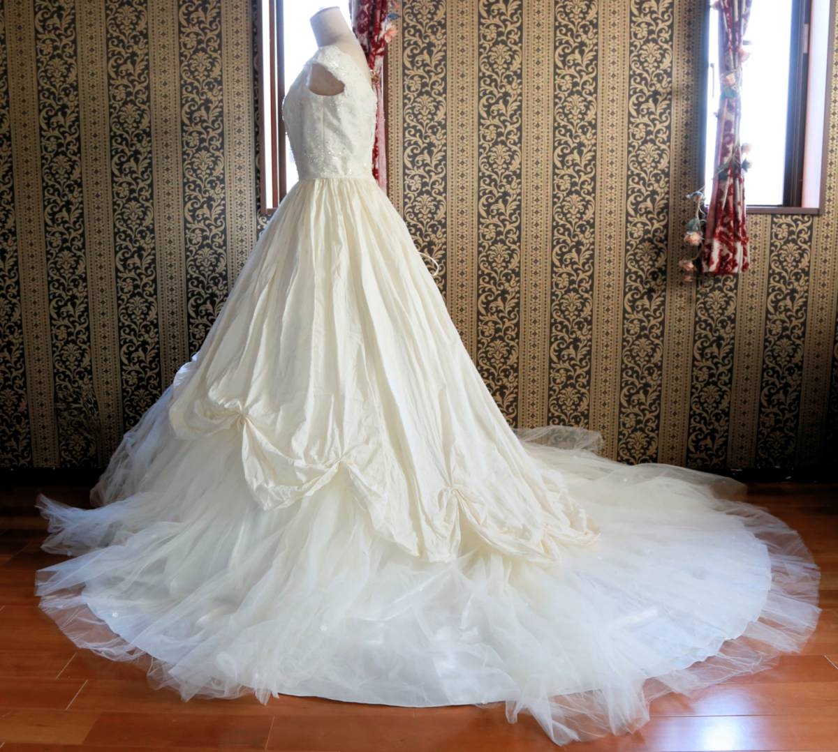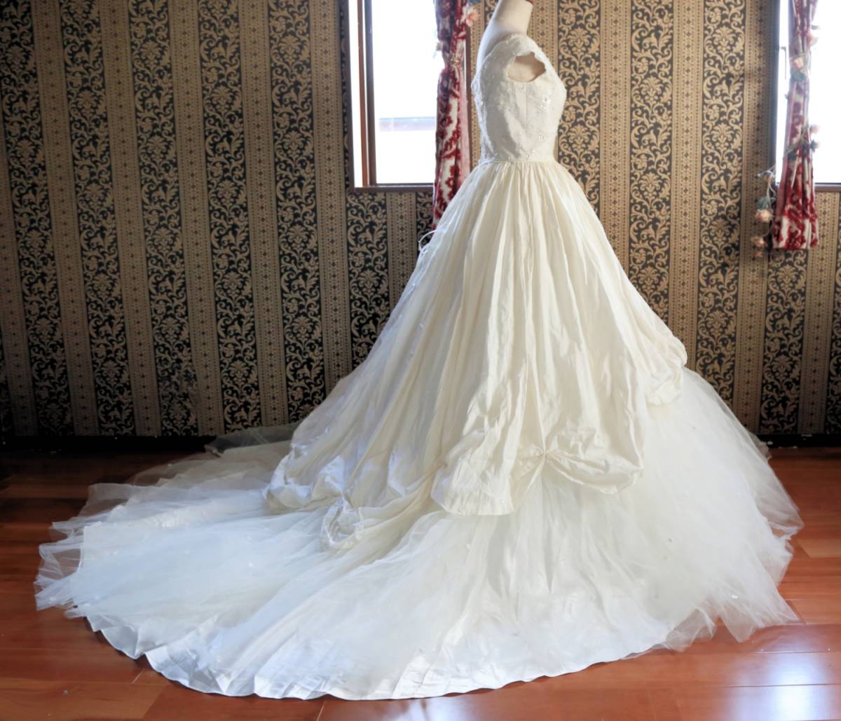実寸はバスト約8090cm、ウエスト約6470cm、前中心から裾までの丈約142cm、脇下から裾までの丈約149cm、後ろ丈約180cm、多少の誤差はご了承ください