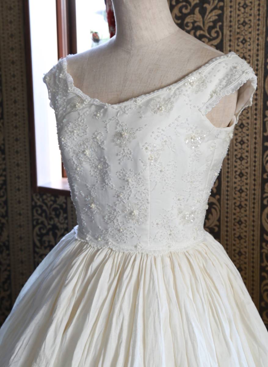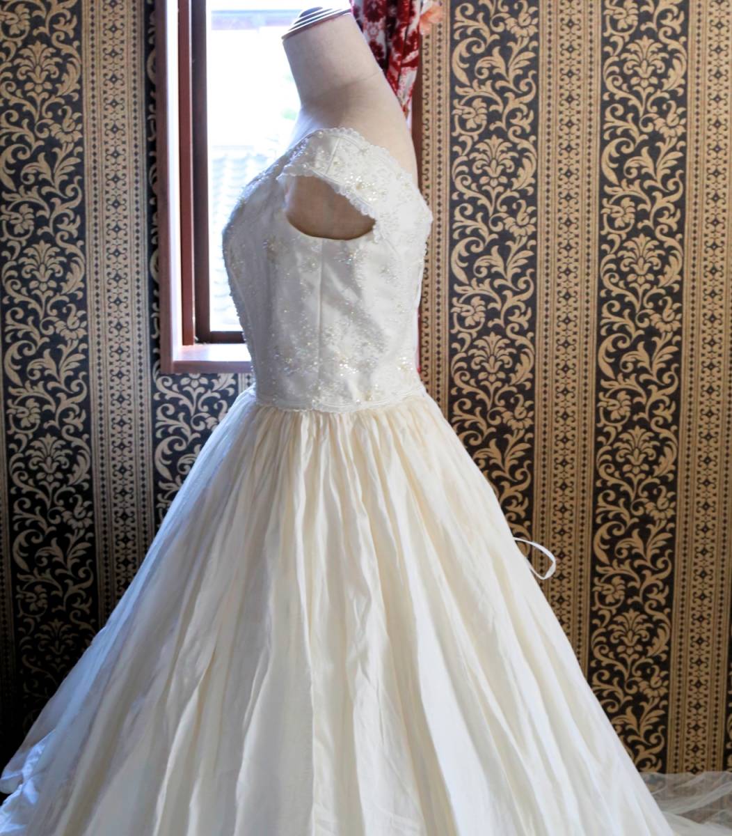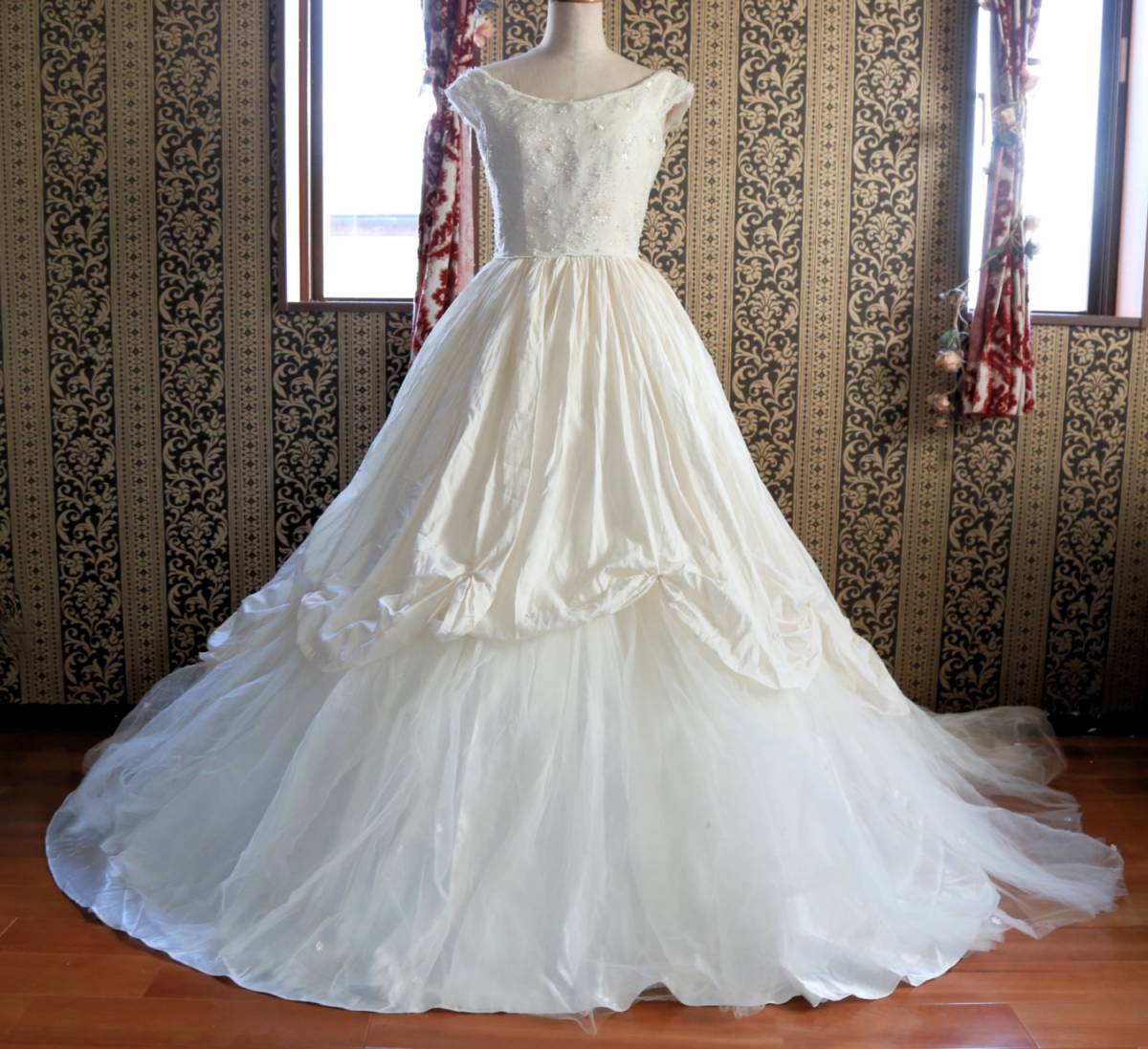 実寸はバスト約8090cm、ウエスト約6470cm、前中心から裾までの丈約142cm、脇下から裾までの丈約149cm、後ろ丈約180cm、多少の誤差はご了承ください