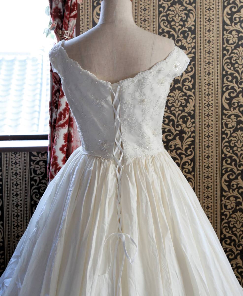 海外挙式にオススメ、コンパクトに持ち運べて便利な高級ウエディングドレス9号11号13号M~LLサイズ編上げ調節可能オフショルダー