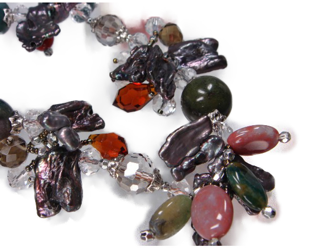 素材天然石と天然淡水真珠です。留め具の部分の材質はステンレスです 。真珠の照り非常に良い、淡水真珠特有の凹凸が若干ございます。