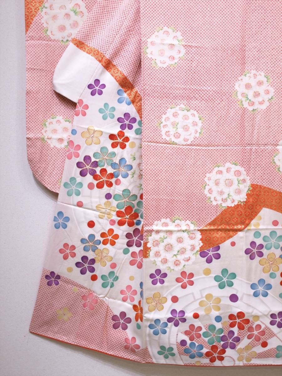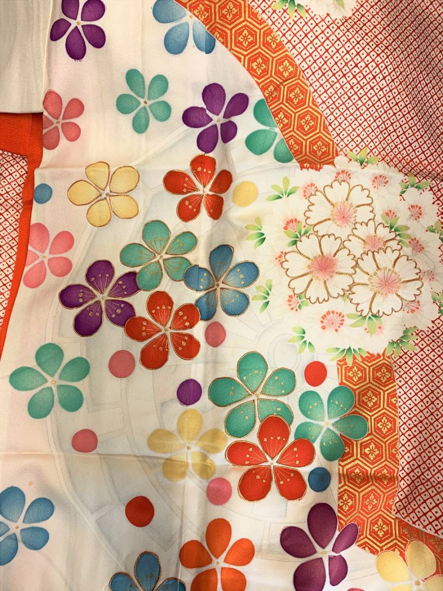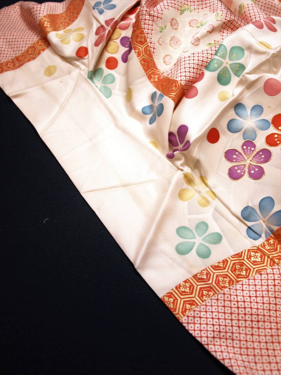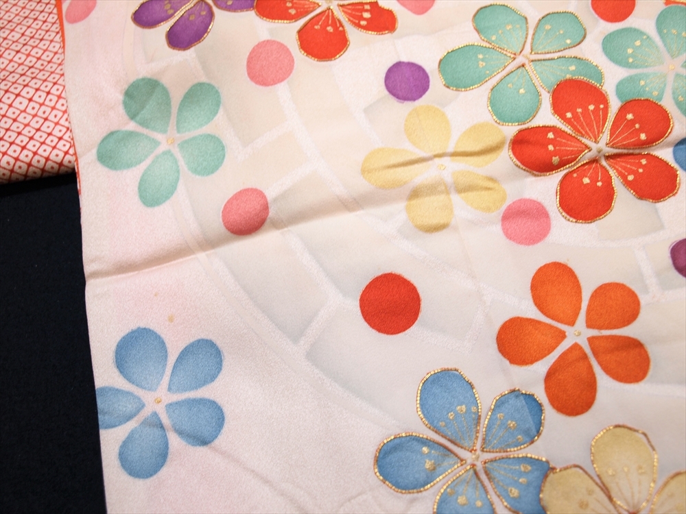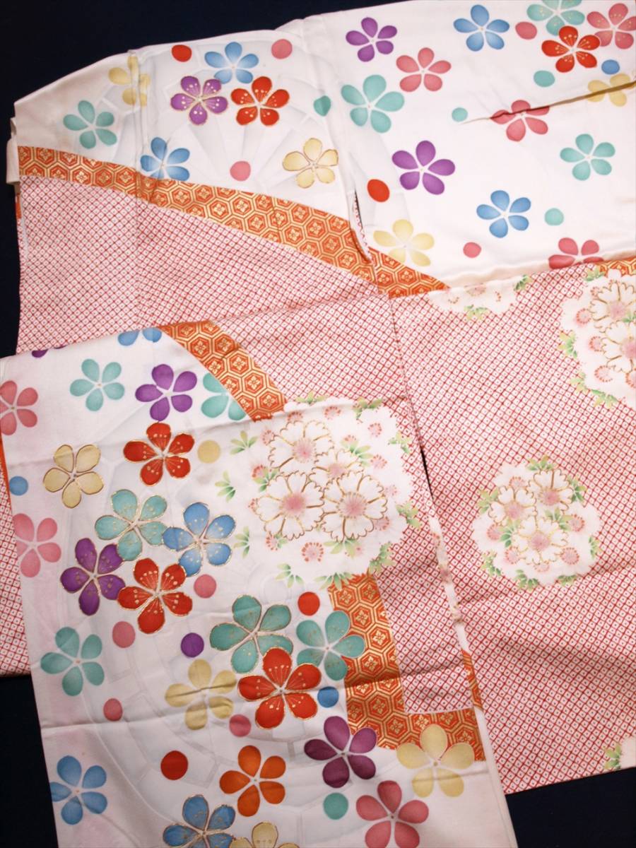 花とら●リサイクル着物 振袖 桜 梅 鹿の子 薬玉 源氏車 可愛い 白地 カラフル 十三参りにも 220519