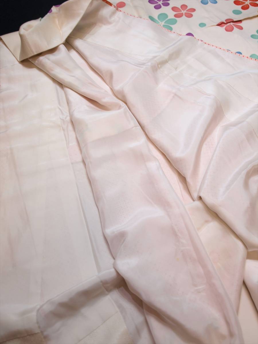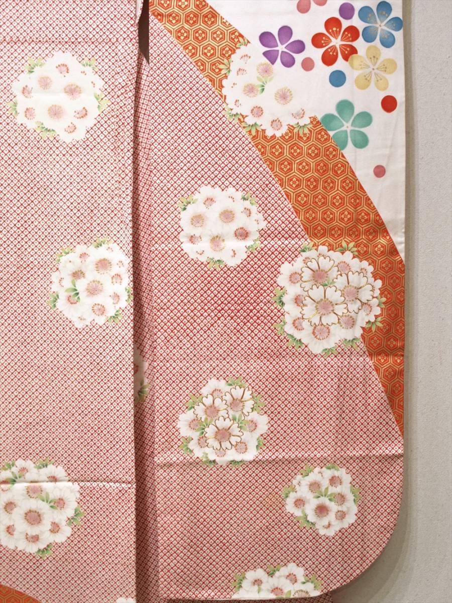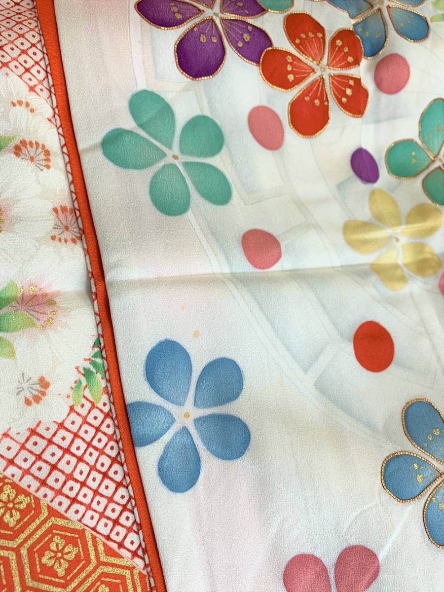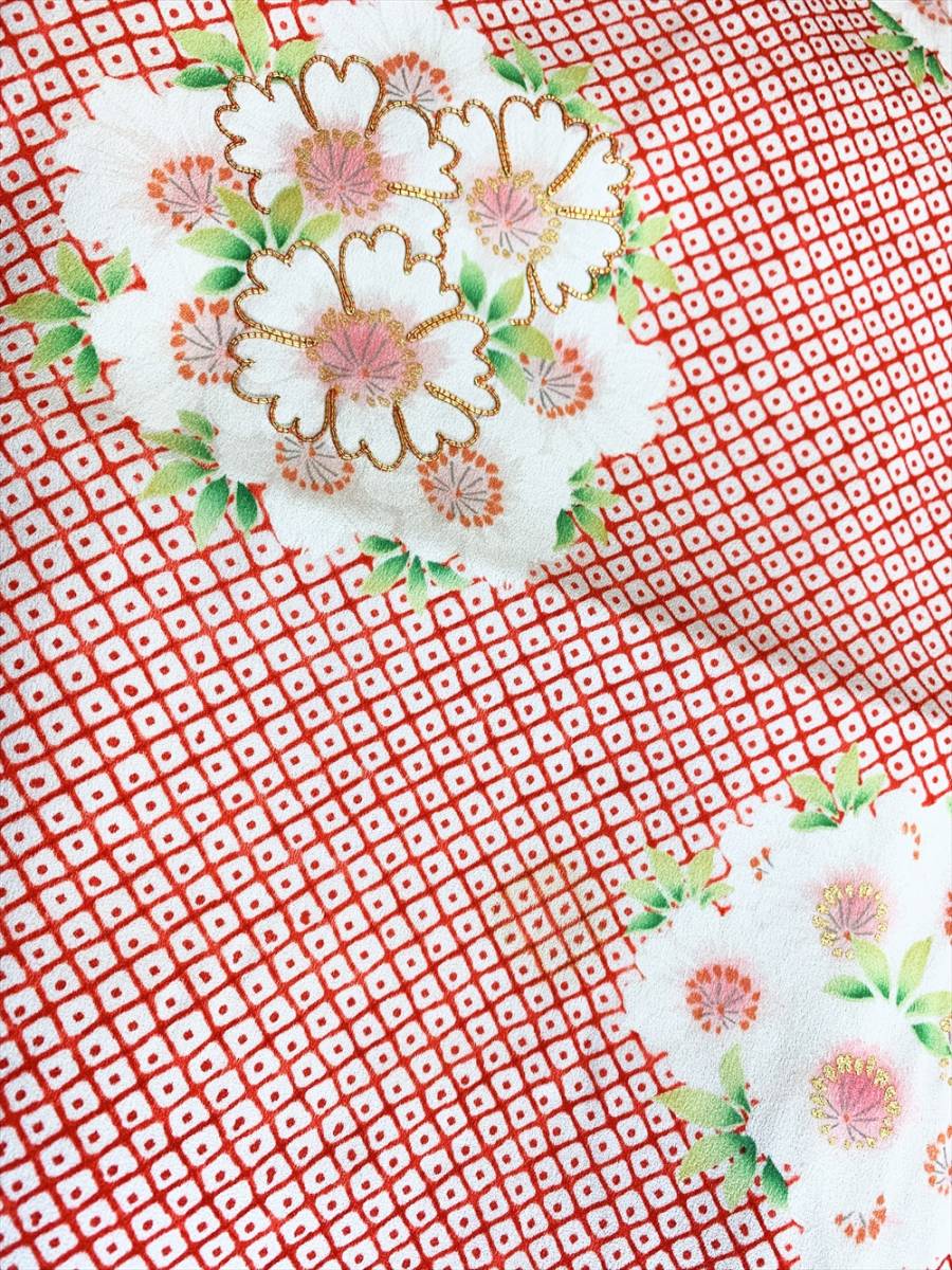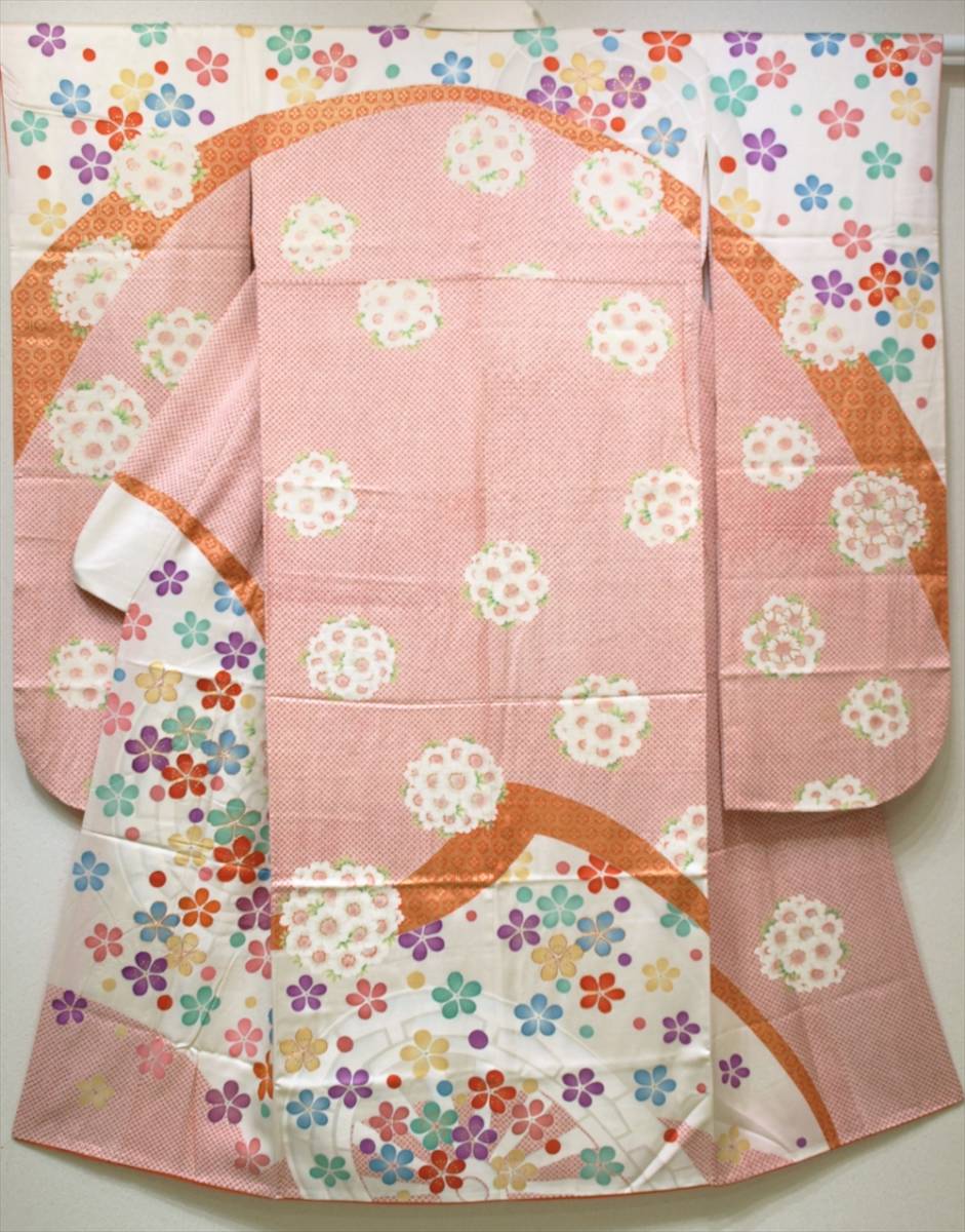 花とら●リサイクル着物 振袖 桜 梅 鹿の子 薬玉 源氏車 可愛い 白地 カラフル 十三参りにも 220519